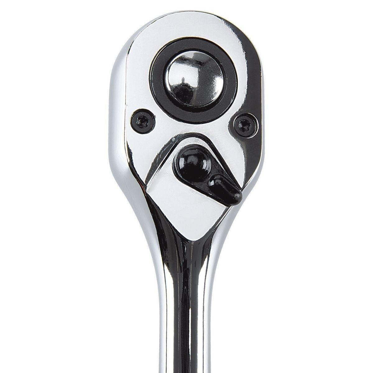 This high visibility 1/2 in. socket set features easy-to-read markings so you spend less time looking for the right socket and more on the task at hand. The rugged chrome vanadium SAE and metric set includes a quick-release ratchet with reversible 72-tooth gearing and a cushion grip to reduce hand fatigue. Triple chrome plating helps fight rust and corrosion.