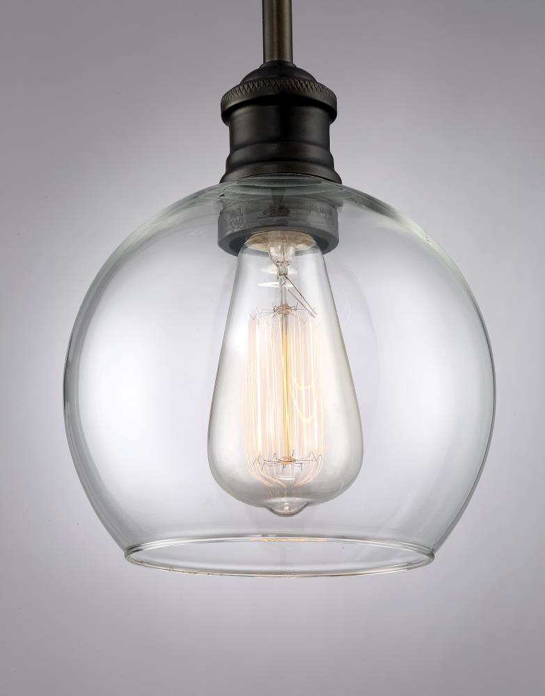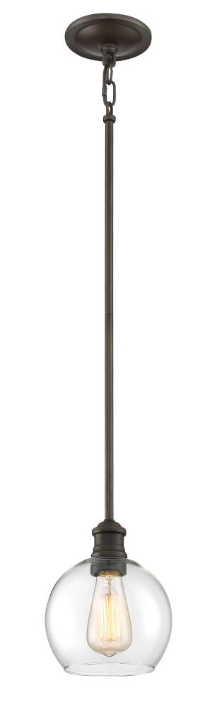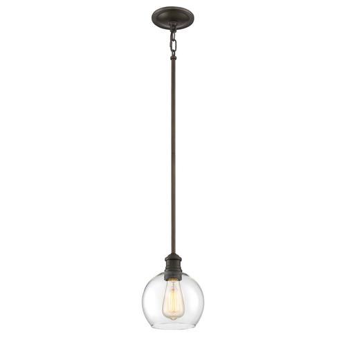 A sleek transitional mini pendant from Quoizel’s Soho collection, featuring a bronze finish and mouth-blown clear glass globe. Designed for adjustable hanging heights, it hardwires to indoor ceilings and pairs beautifully with vintage-style filament bulbs for a chic statement.