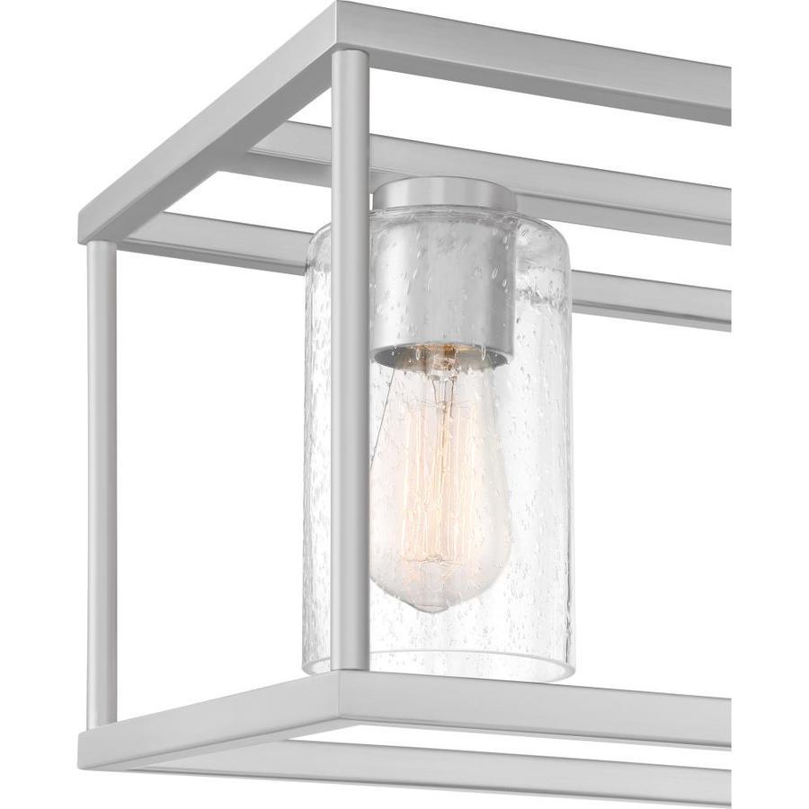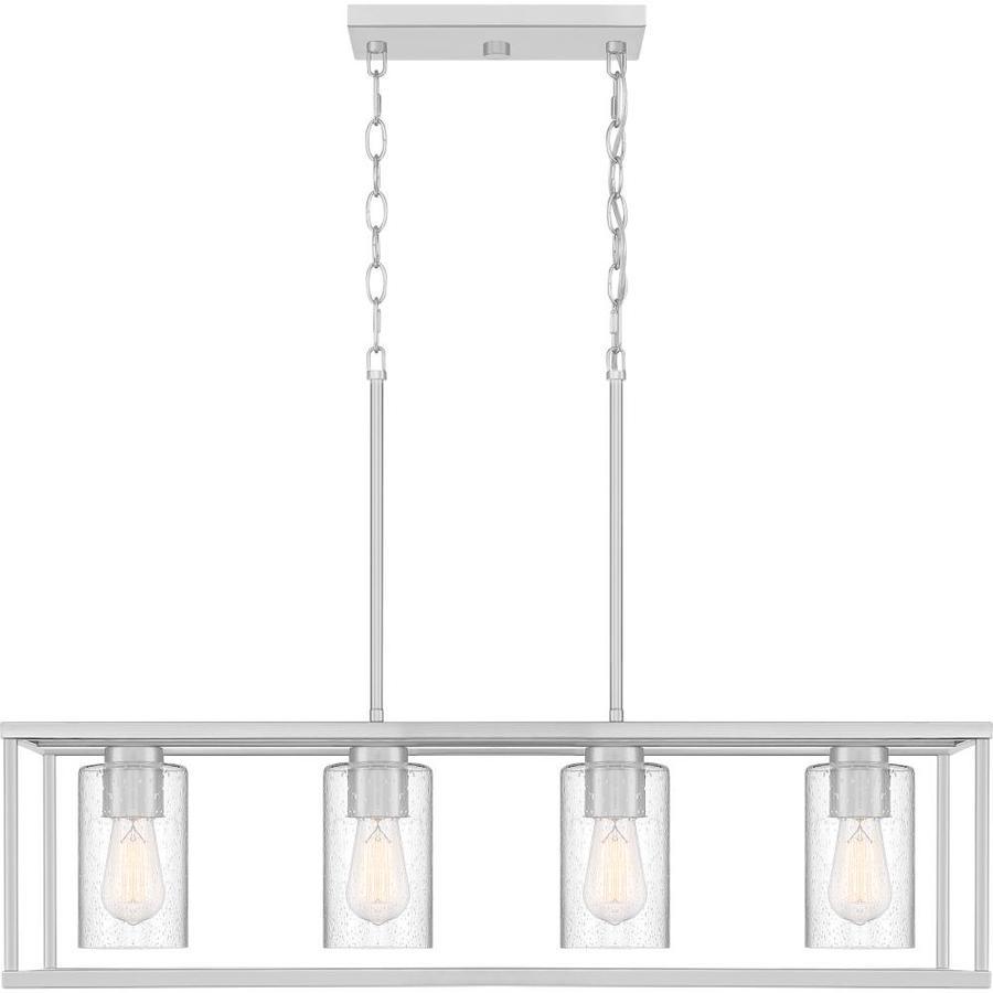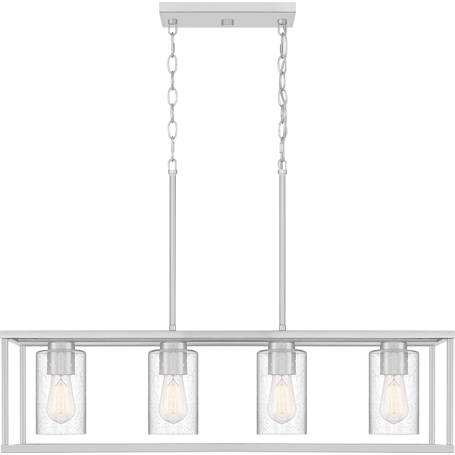 A sleek, industrial-inspired linear chandelier from Quoizel’s Dover collection. Brushed nickel framing pairs with clear seeded glass shades for a refined, diffused glow. Ideal for kitchens, dining rooms, and foyers with adjustable hanging height and dimmable performance.