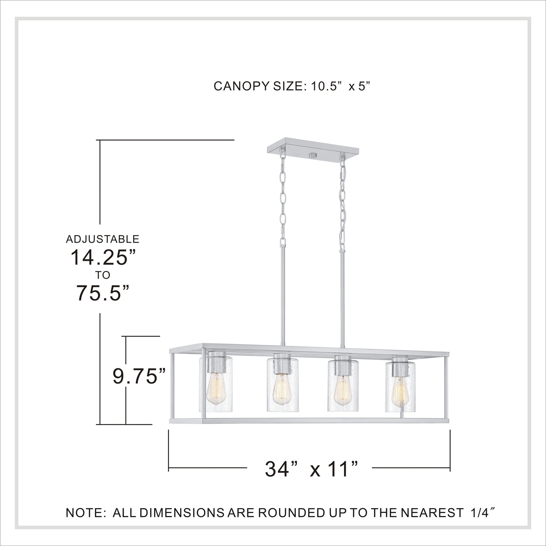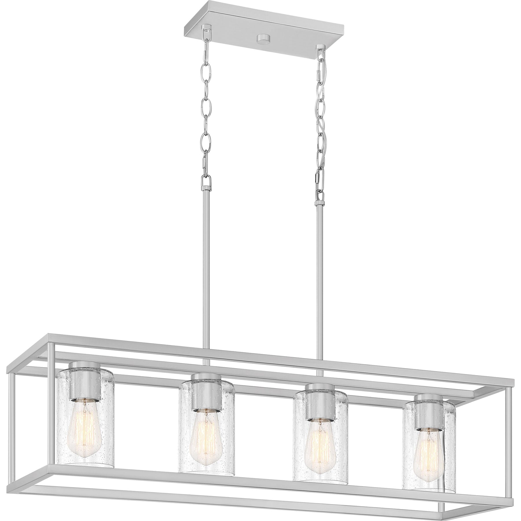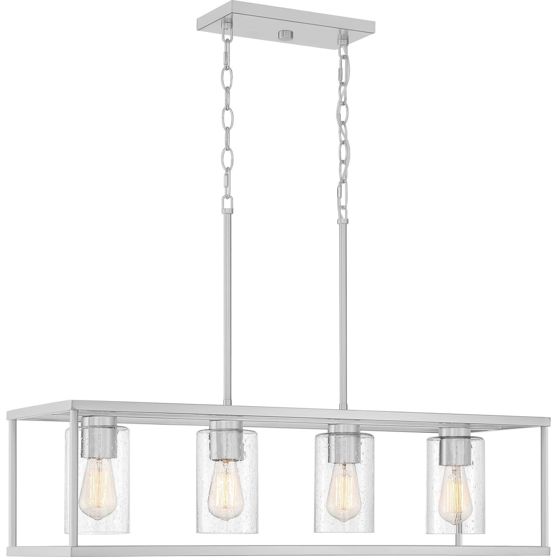 A sleek, industrial-inspired linear chandelier from Quoizel’s Dover collection. Brushed nickel framing pairs with clear seeded glass shades for a refined, diffused glow. Ideal for kitchens, dining rooms, and foyers with adjustable hanging height and dimmable performance.