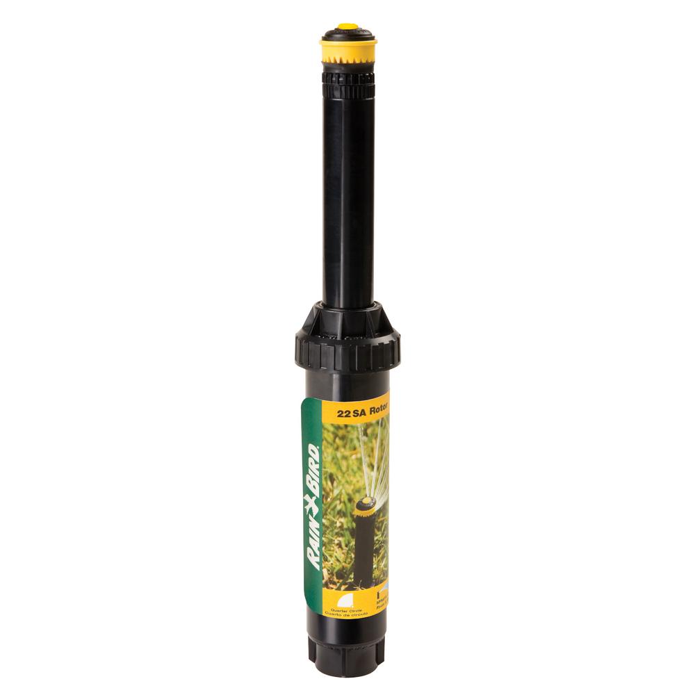Rain Bird's 22SA rotary sprinklers provide highly uniform water distribution and an increased radius range of up to 24 ft. covering more area with fewer heads. At the same time, the sprinkler produces remarkably low precipitation rates of 0.6 in. per hour, reducing water use up to 30%. The secret is in the nozzle's rotary multi-stream action. The water delivery is gentle enough for newly seeded areas and hillsides, yet covers more area than standard pop-up sprays. The extended throw also allows you to use fewer heads per zone to reduce system complexity. And the 22SA nozzle's water droplets are larger than traditional sprinkler droplets, resisting windblown overspray. The 22SA is easy to adjust: simply use a standard slotted screwdriver to adjust the throw distance from 17 ft. to 24 ft. Other features include a 4 in. pop-up height; a protected closed-case design that makes these sprinklers ideal for creeping grasses, sandy soil, and other harsh surroundings; and a water-lubricated rotating stream operation that's quiet and maintenance-free. This version of the 22SA produces a 90° quarter-coverage pattern; the 22SA is also available in full and half patterns.