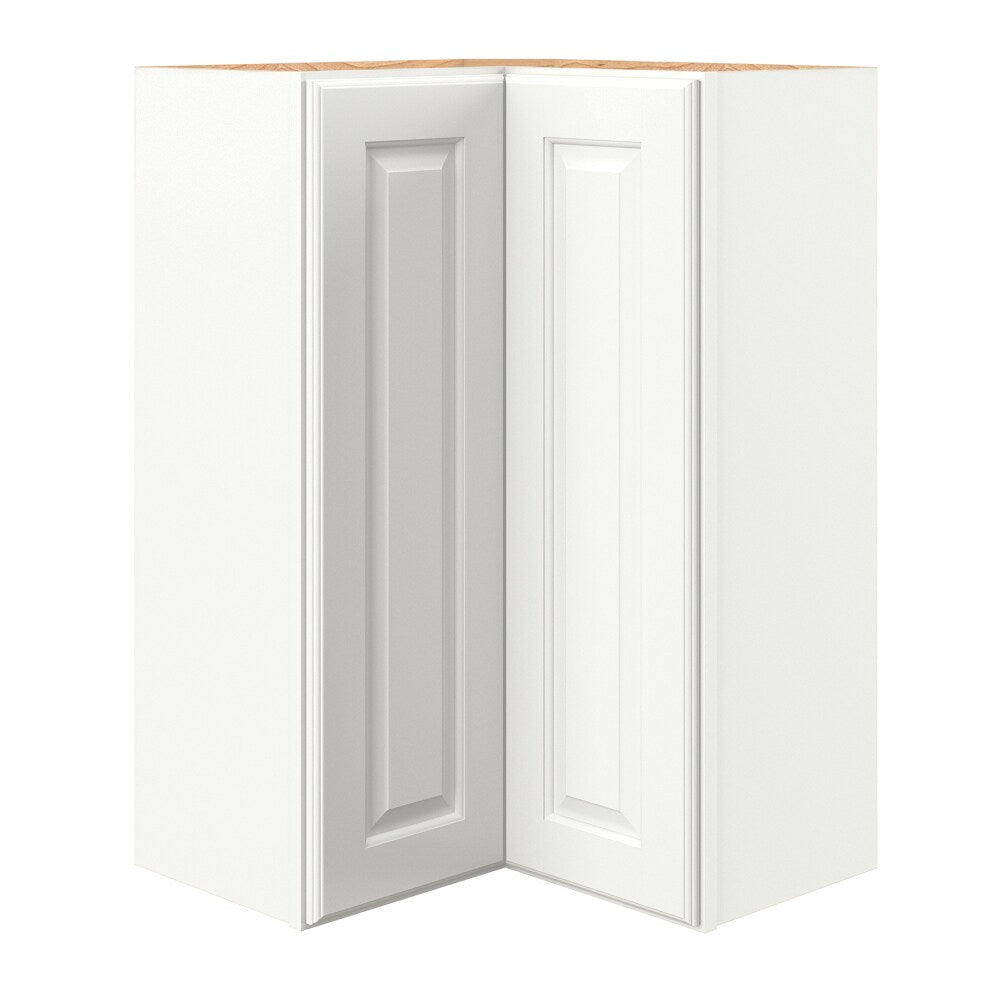 The Linen L-shaped Corner Wall Cabinet from the Tilson collection offers a seamless, modern look with its raised panel square style and full overlay doors. Pre-assembled for your convenience, this cabinet combines both engineered materials and hardwood to ensure long-lasting durability.