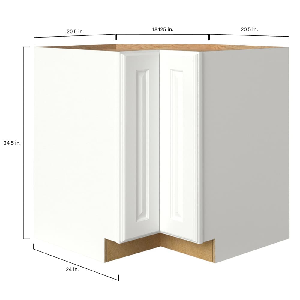 Transform your kitchen with the allen + roth Tilson Corner Base Cabinet, featuring a raised panel design for a classic, tailored look. Made from robust wood and MDF, this L-shaped cabinet boasts a sophisticated linen painted finish. Designed for corner placement, it maximizes storage with an adjustable shelf, ensuring functionality in any kitchen setup.