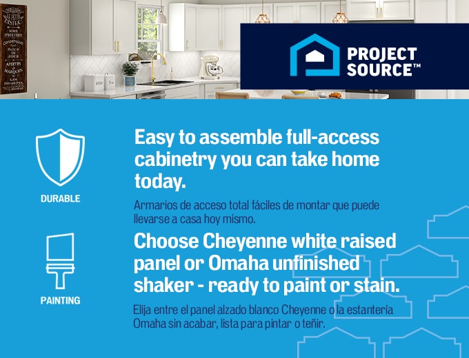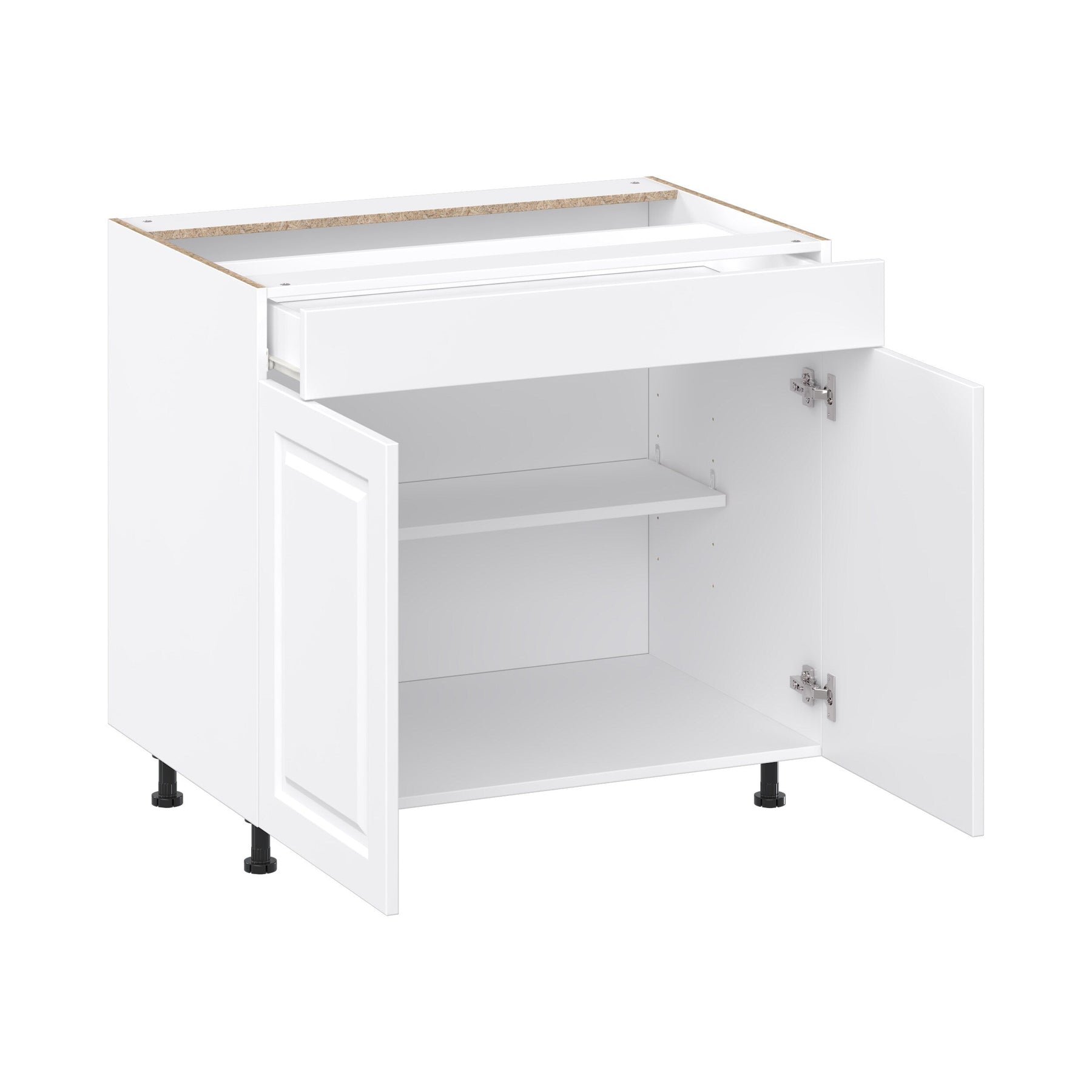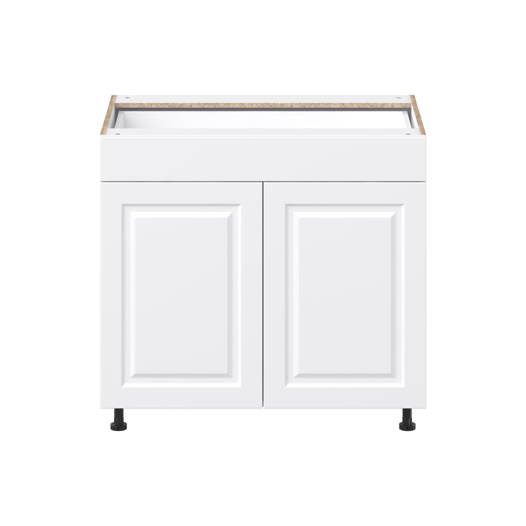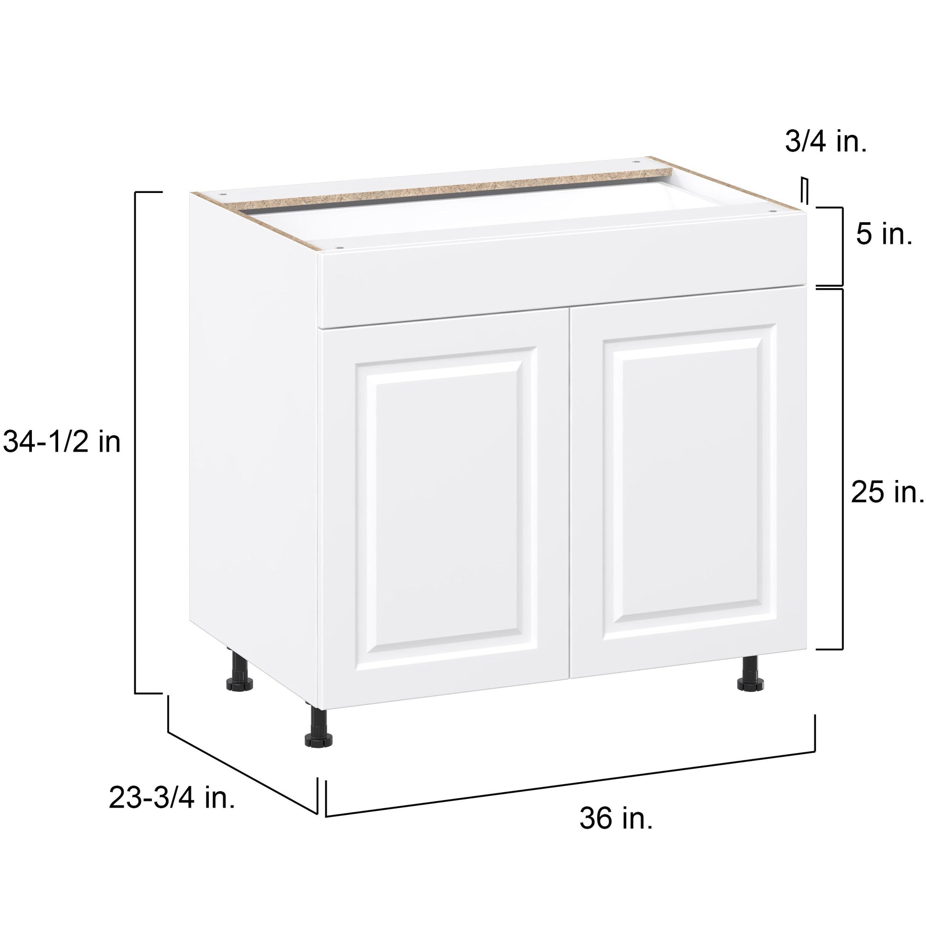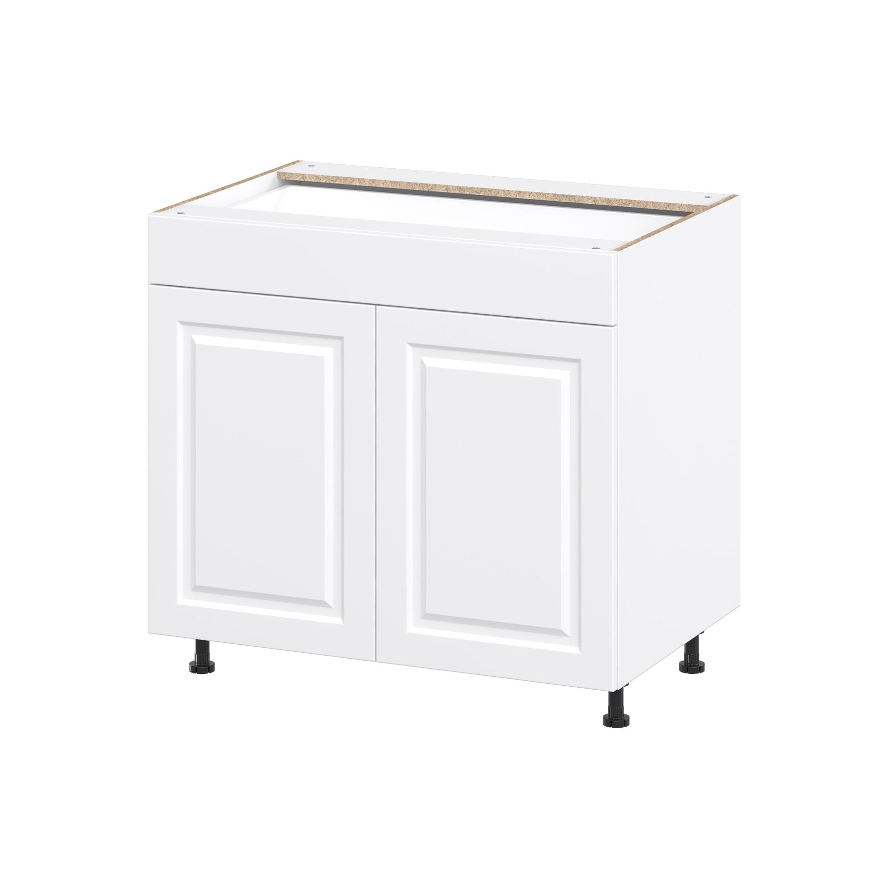 Enhance your kitchen or workspace with the Project Source 36-in White Base Cabinet, featuring a traditional raised panel design and smooth, clean lines. Ready to assemble, this cabinet combines style and functionality with a scratch and moisture-resistant finish, making it a durable solution for any home project.