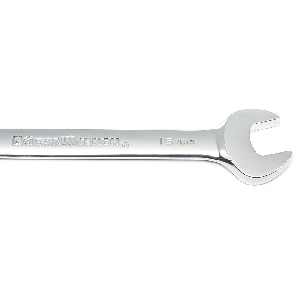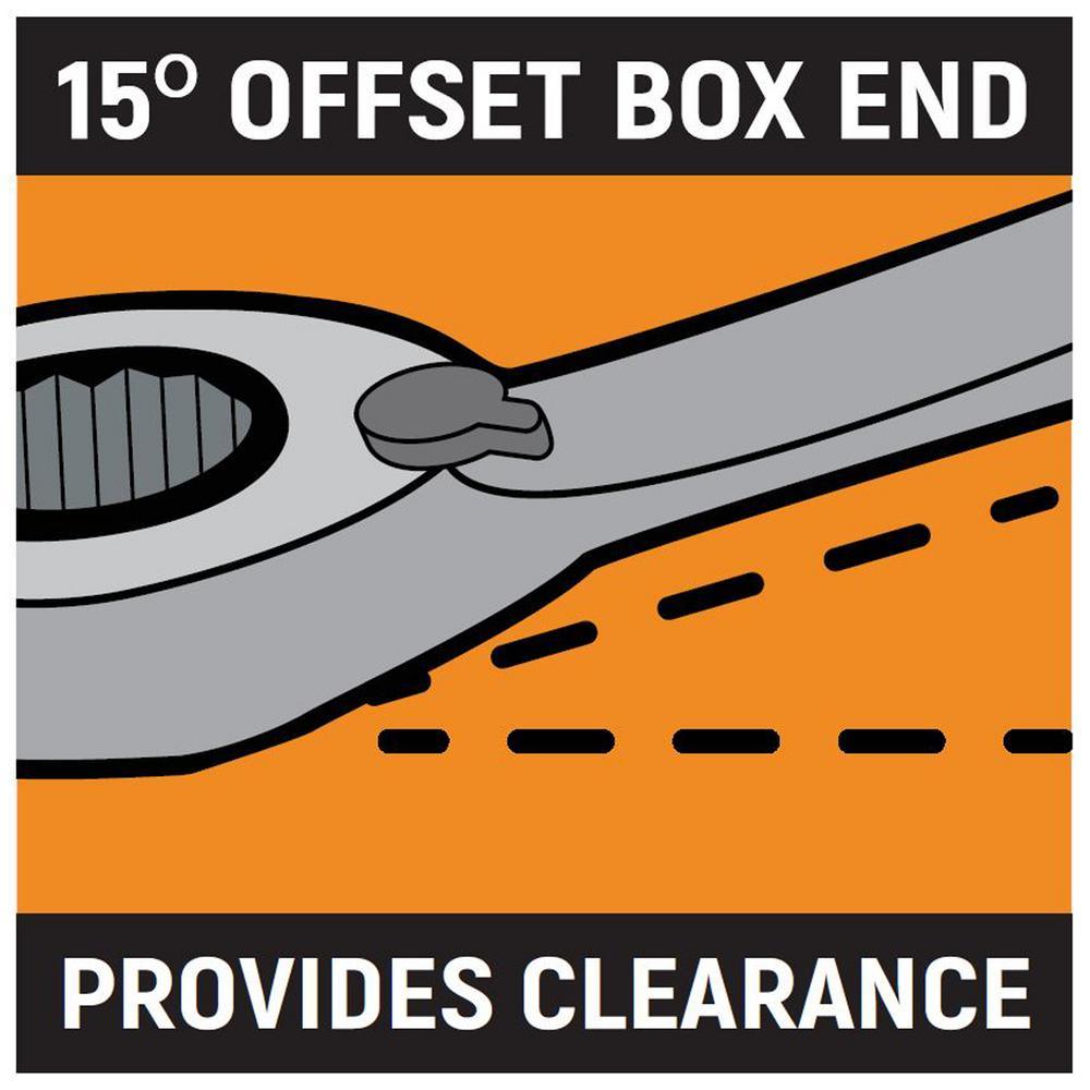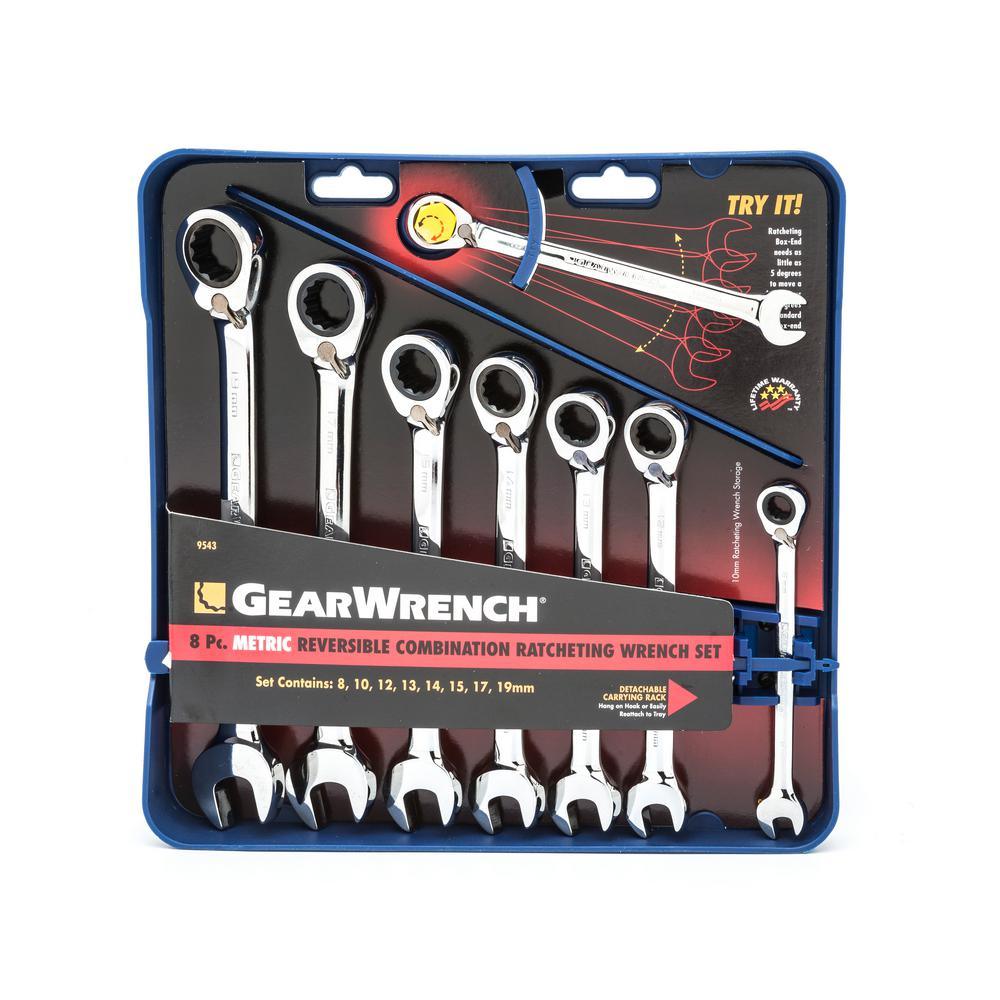 The GearWrench 8-Piece Metric Reversible Combination Ratcheting Wrench Set delivers up to 25% more torque with open end wrench. The ratcheting box-end needs as little as 5° to move a fastener versus 30° for standard box end wrenches. IT features a compact reversing lever which allows the change of direction with the flick of a thumb.