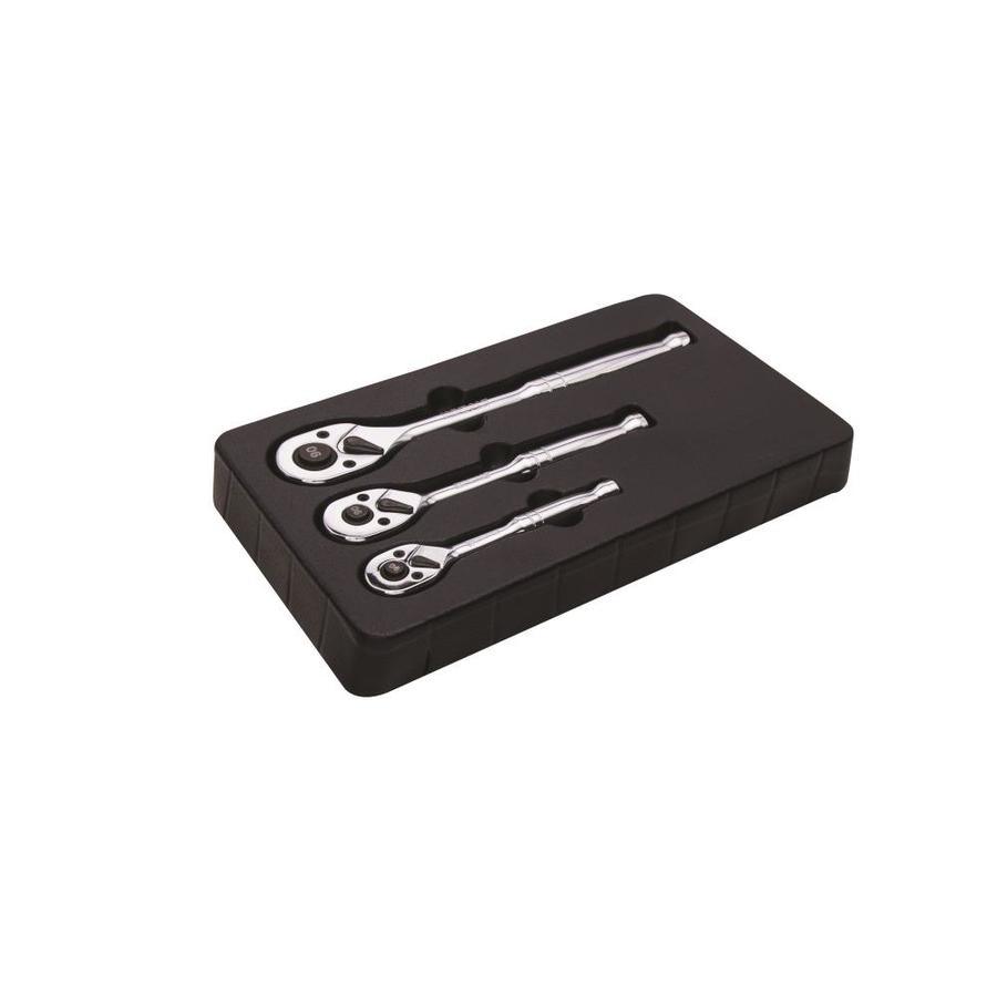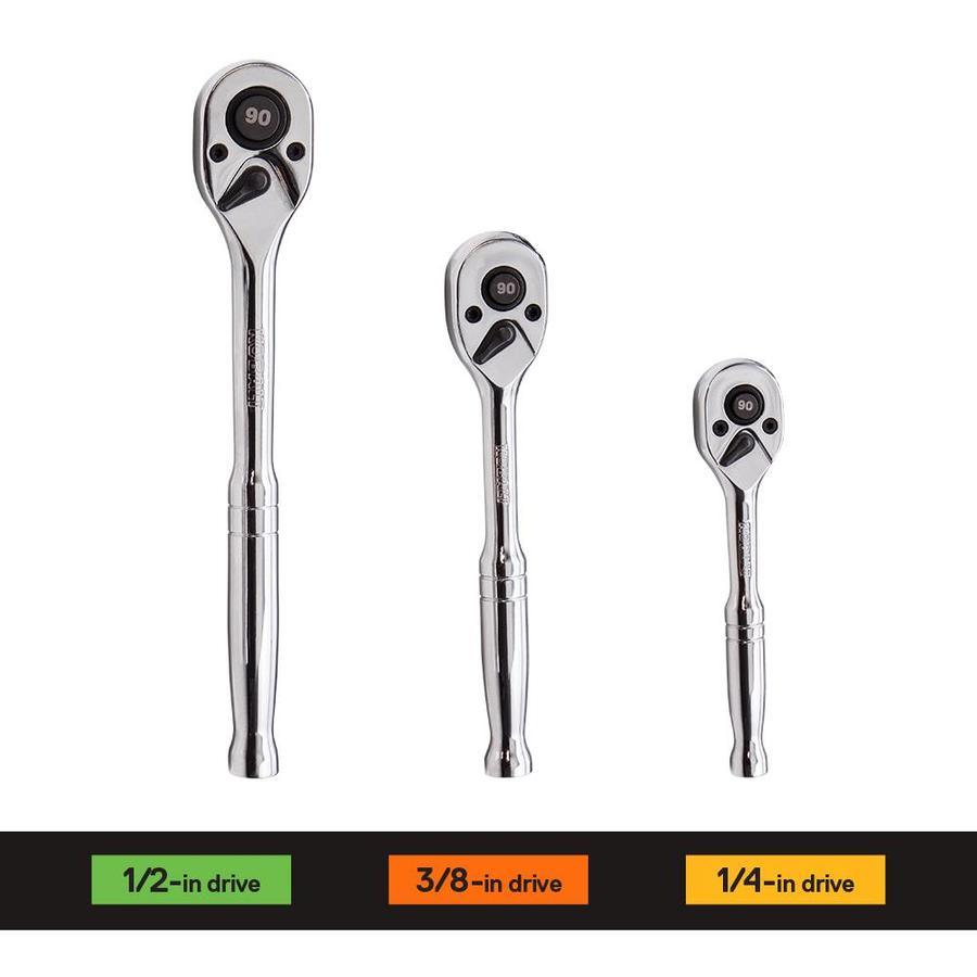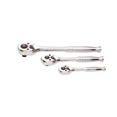 New Improved Precise Pro90 Ratchet 90-tooth gear delivers a 4 ° precision swing that offers improved mobility in tight work spaces This 3 piece ratchet set offers 1/4-in, 3/8-in and 1/2-in drive ratchets, ensuring that you have the correct drive size within reach at all times Quick-release button allows rapid socket and/or accessory change Constructed of chrome vanadium steel and heat treated for strength and durability Professional grade, high-polish finish makes cleaning your ratchets a snap Forward/reverse switch moves smoothly and allows for an easy change of direction in the middle of a project without removing the ratchet/socket from the fastener Designed and tested to exceed ASME specifications Hassle-free lifetime guaranteed