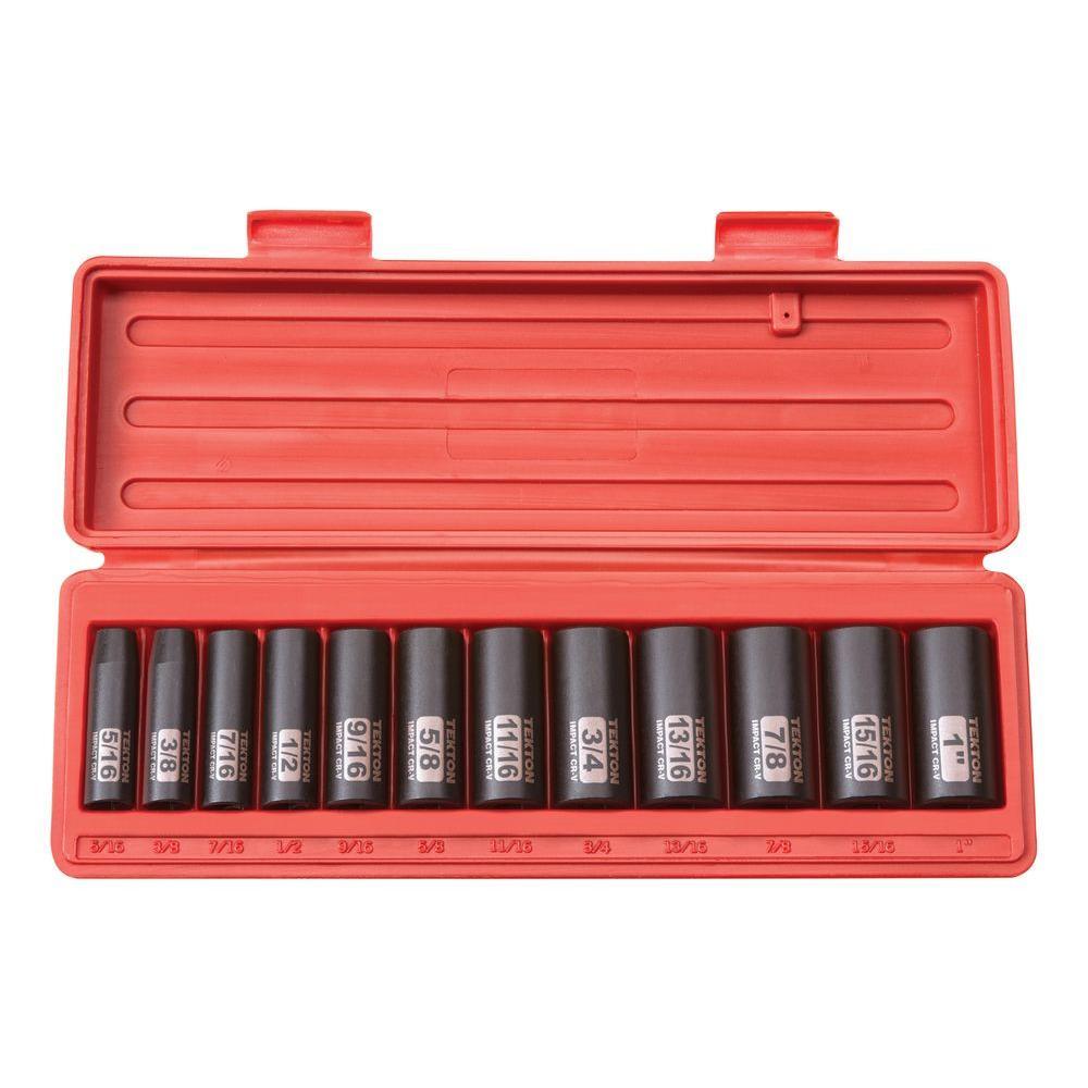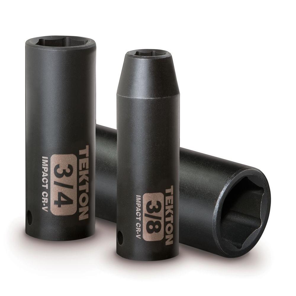 Built for use with impact tools, these TEKTON 3/8 in. Drive Deep Impact Sockets effortlessly break free rusty suspension and exhaust bolts, quickly remove stuck lug nuts, and loosen crank bolts with ease. TEKTON impact sockets efficiently transfer torque from impact wrench to fastener, loosening the most stubborn nuts and bolts. Made from high-strength chrome vanadium steel, our impact sockets are more resistant to drive end round out than standard impact sockets, resulting in a longer useable life. TEKTON impact sockets meet or exceed ANSI performance standards. The high-torque, 6-point socket grips the broad, flat sides of nuts and bolts, not just the corners, so there is no need to worry about stripping fastener head or damaging socket. An extra-deep broach enables you to access the entire length of fasteners. Even in low light, the high-contrast, permanent laser etched size markings are easy-to-read. The customized red TEKTON case can be stored in a tool chest or carried to your job site. Molded size markings keeps set organized and identifies any missing sockets.
