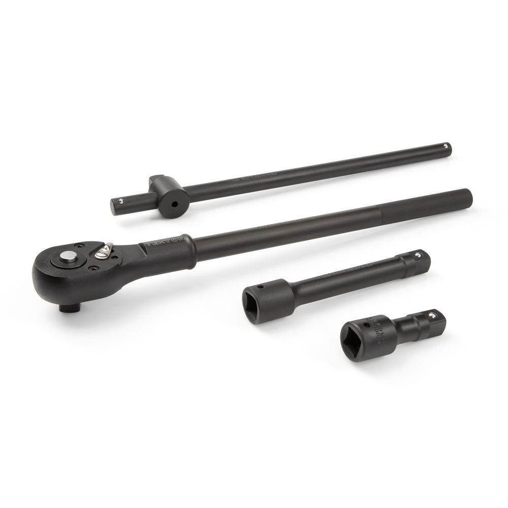 From trucks and tractors to heavy equipment and large machinery, big service and repair jobs need the TEKTON 3/4 in. Drive Impact Socket Set (21-Piece), with a range of sizes from 3/4 to 2 in. Whether you drive them with an impact wrench or by hand, these premium chrome vanadium sockets deliver superior performance. To prevent stripping or round-off under high stress, they feature a 6-point, high-torque design that contacts and grips the stronger flat sides of nut or bolt head, not the weaker corners. Extra large, high-contrast size markings are permanently laser etched onto each socket, making size selection quick and easy, even in low light. The 18 in. 24-tooth quick-release ratchet, with non-slip knurled handle, locks onto sockets so they will not stick to fastener or fall off. To loosen frozen fasteners, grab the 18 in. breaker bar. Its sliding T head can be positioned at any point for maximum two-handed leverage. All parts are protected by a durable, corrosion-resistant black phosphate finish, and store in a heavy duty carry case.