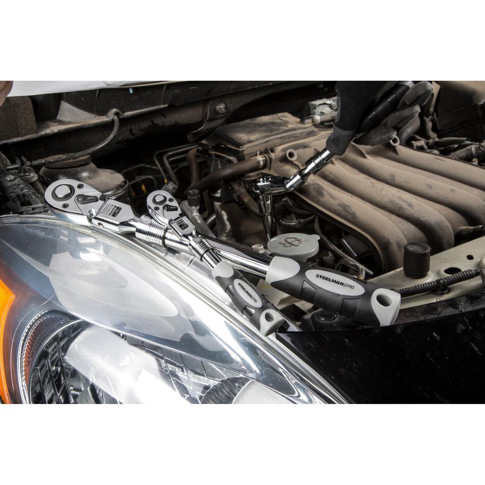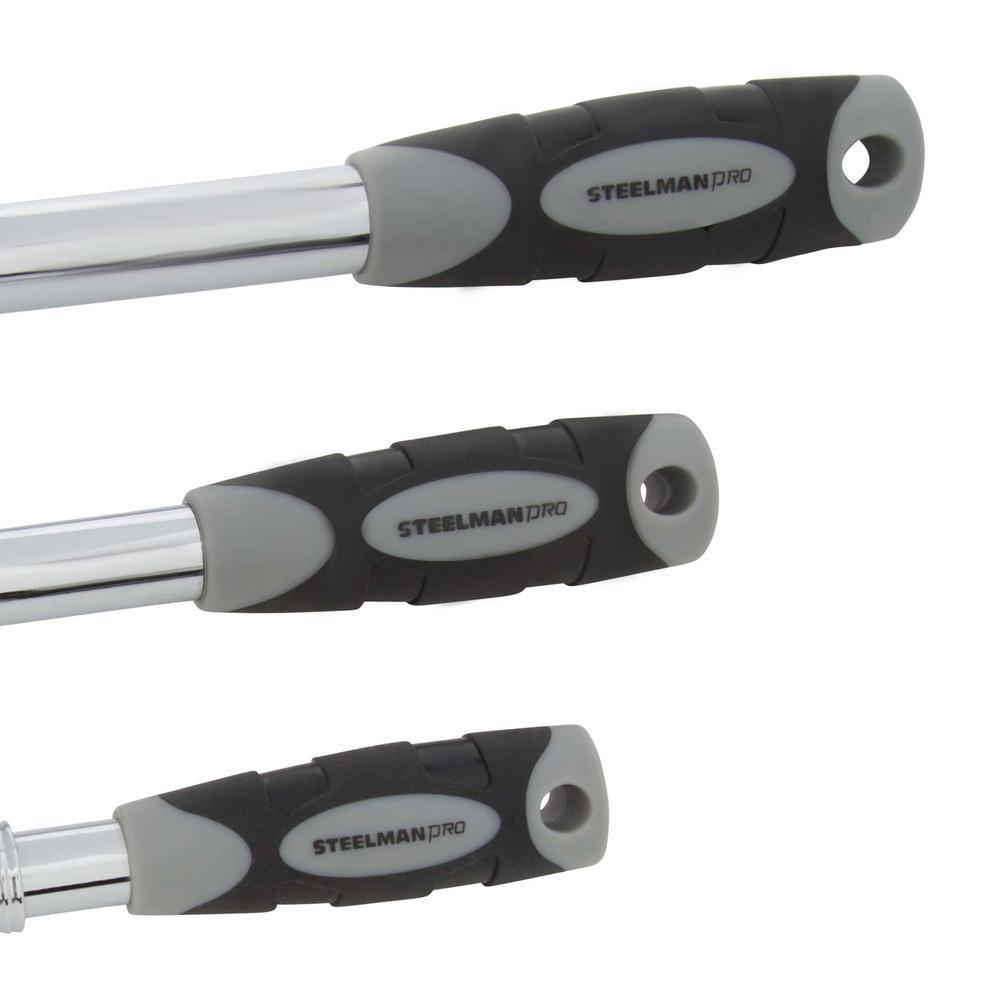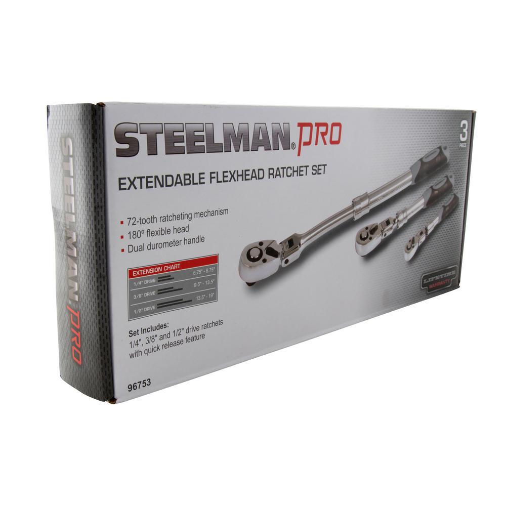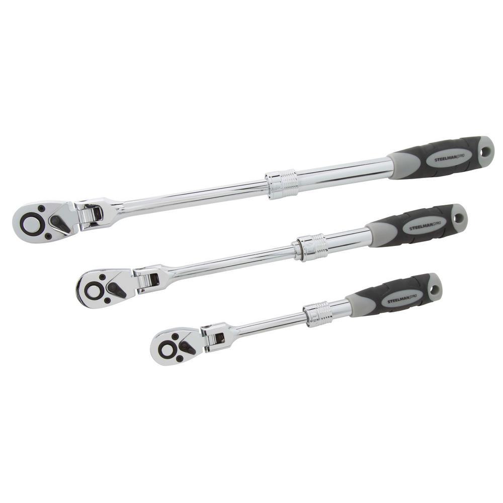 Easily reach and remove those hard to work on fasteners found inside confined spaces like the engine compartments of compact cars with the STEELMAN PRO 96753 Extendable Flex-Head Ratchet Set. This 3-piece set of ratchets have extra-long extending handles that give you exceptional reach while simultaneously providing increased leverage. The 1/4 in. drive ratchet extends from 6.75 in. to 8.75 in., the 3/8 in. drive ratchet extends from 9.5 in. to 13.5 in., and the 1/2 in. drive ratchet extends from 13.5 in. to 19 in. Each ratchet head features a 72-tooth reversible ratcheting mechanism that only needs a 5° arc to engage from tooth to tooth, letting you do more work in smaller spaces. This mechanism is then mounted to a 180° flexible neck that lets you position the ratchet head to the angle you need to work from rather than try to angle and twist yourself to accommodate the tool to the fastener. When finished a quick-release button on the back of the ratchet allows effortless removal of attached sockets and extensions. Made from strong and durable heat-treated chrome-vanadium steel with polypropylene and TPR rubber handles these tools are chemical and corrosion resistant and can easily withstand the rigors of everyday use.