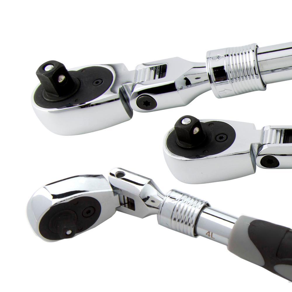 • Flexible heads - each ratchet has a 180° flex head that allows you to easily reach fasteners at almost any angle
