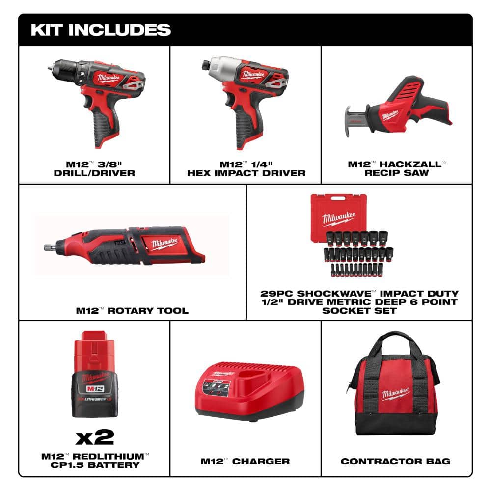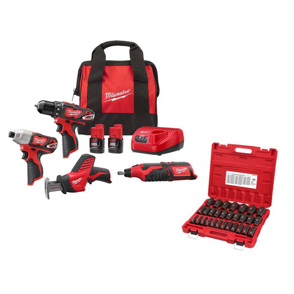 Milwaukee M12 12V Li-Ion Cordless 4-Tool Combo Kit w (2) Compact 1.5Ah Batteries and Charger w 1/2 in. Metric Socket Set (29-Pc)