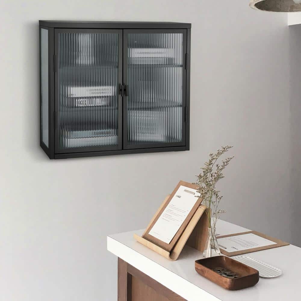 This Black Metal Wall Kitchen Cabinet brings a sophisticated industrial touch to any room. Its sleek fluted glass elegantly diffuses light, creating ambiance while maintaining privacy. Detachable shelves allow for artful displays of unique pottery or vintage finds. This stylish piece is a quintessential addition to any luxurious setting, effortlessly elevating your home decor.