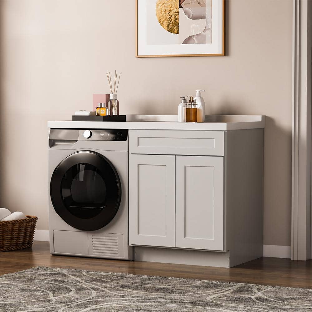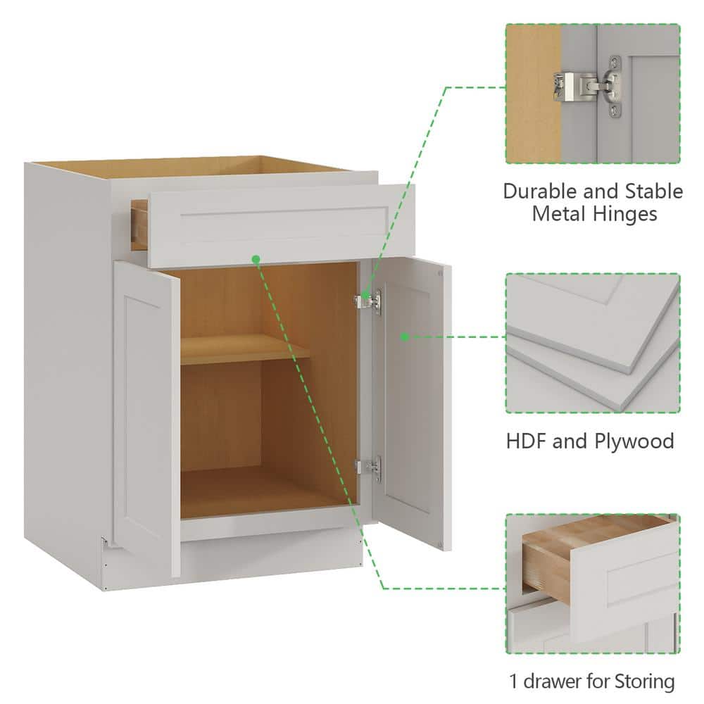 Enhance your kitchen's functionality and style with the Shaker Dove Ready-to-Assemble Base Cabinet. Crafted from durable plywood and HDF, this cabinet offers versatile storage with adjustable shelves and drawers, complete with a noiseless soft-close feature. Its elegant gray finish not only beautifies your space but also provides long-lasting protection.