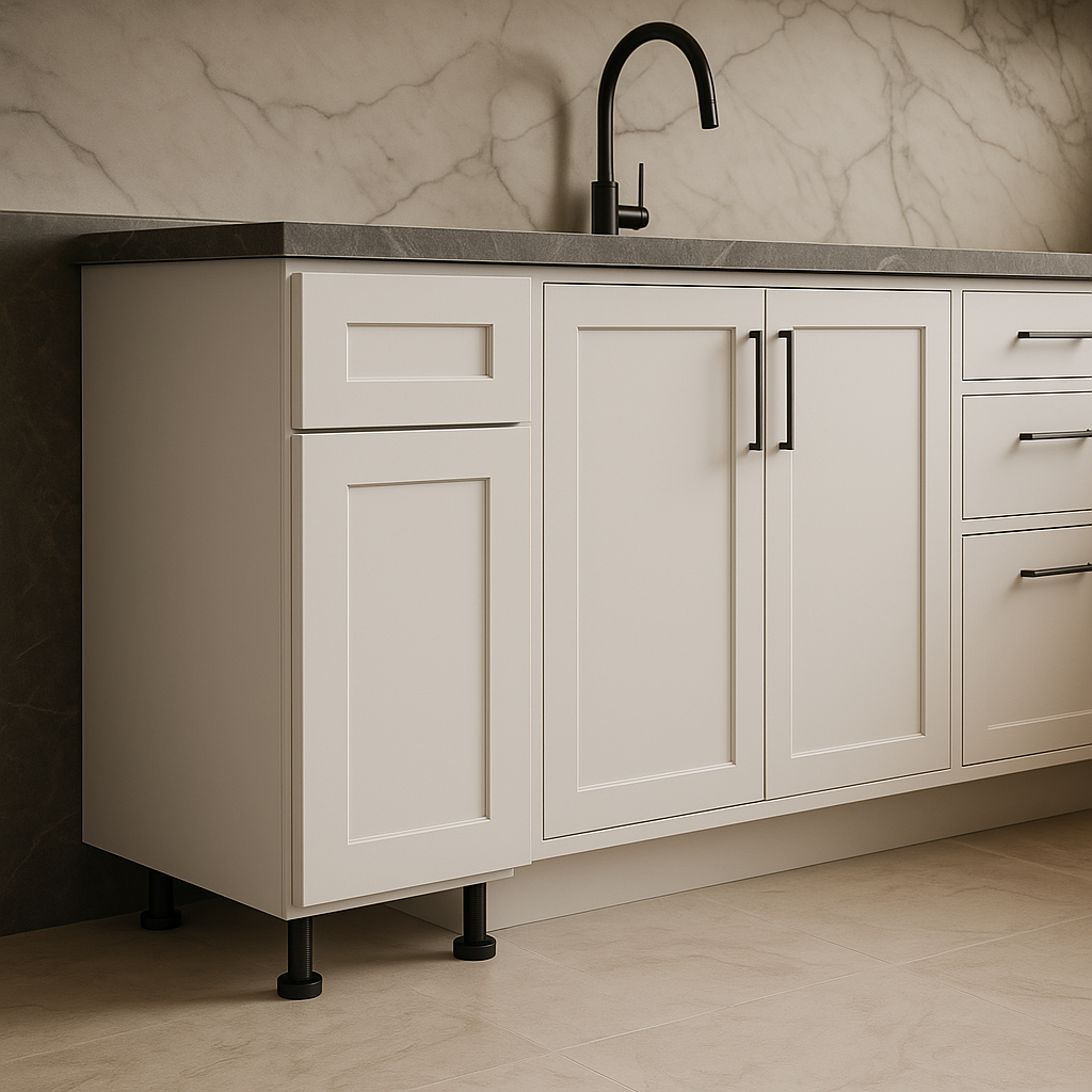 The Cambridge Everest White Shaker Base Kitchen Cabinet combines modern design with practical functionality. Featuring a frameless shaker style, soft-close doors and drawers, and adjustable shelves, this cabinet is perfect for contemporary kitchens.