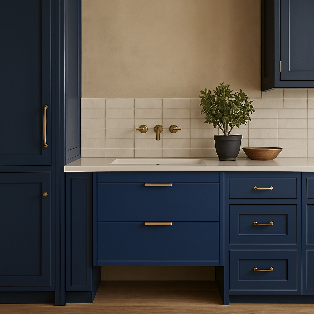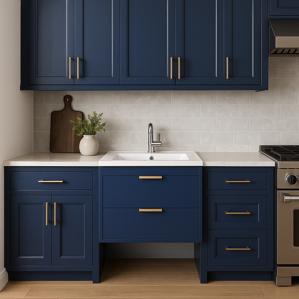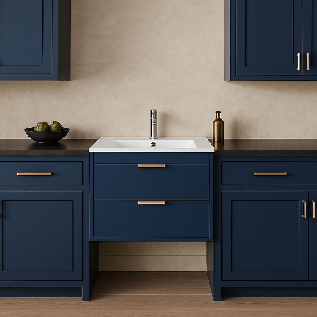 This wall-mounted kitchen cabinet by FUNKOL is a masterpiece of modern design, blending functionality with aesthetic appeal. Its deep blue finish adds a touch of sophistication, while the porcelain sink provides a clean and bright focal point. Perfect for compact spaces, its wall-mounted design frees up floor area, making it ideal for contemporary kitchens. Pair it with sleek metallic accents for a cohesive and luxurious look.