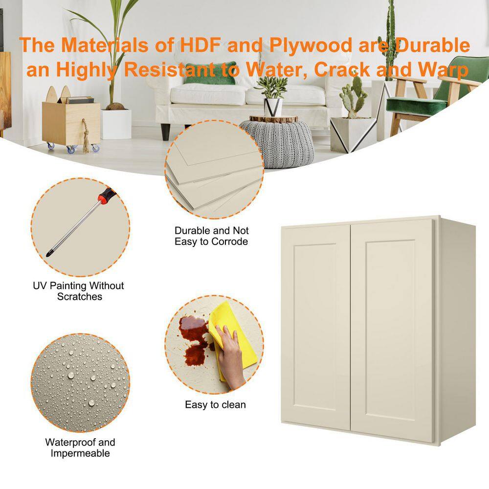 Elevate any kitchen, laundry, or bathroom with the HOMEIBRO Shaker Antique White Wall Cabinet. Crafted from high-strength HDF wood and moisture-resistant plywood, this easy-to-assemble cabinet offers a blend of durability and elegance. Featuring soft-close hinges and a luxurious UV-coated finish, it's a practical and stylish storage solution.