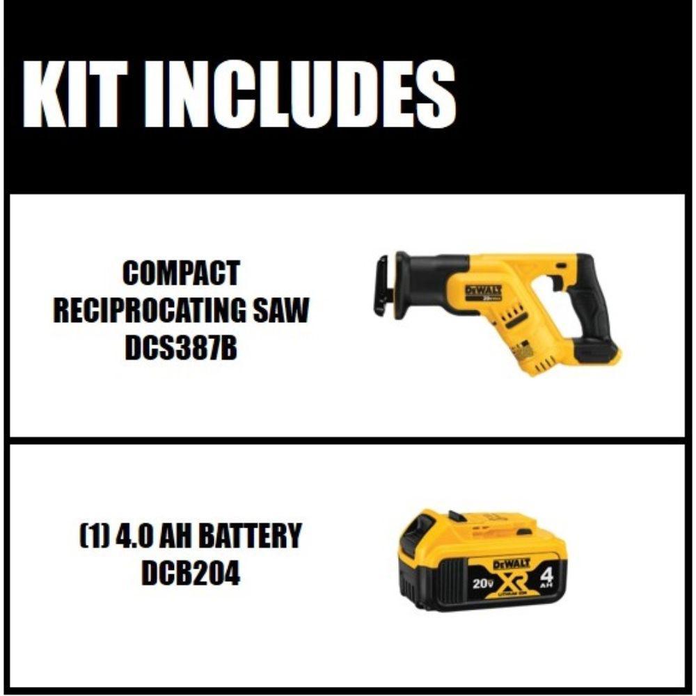 The DEWALT DCS387B Reciprocating Saw features a compact and lightweight design. This saw's 14.5 in. in total length fits between studs and allows users to make cuts in confined spaces. A 4-Position Blade Clamp allows for flush cutting and increased positional versatility with tool free blade changes. The 20-Volt Max Premium XR lithium-ion battery outperforms every DEWALT battery that came before it and thats saying a lot. Get long-lasting power and prolonged life from this 4 Ah battery that weighs just 1.42 lbs. A built-in charge meter lets you know how much juice remains so you don't get caught powerless on a job site.