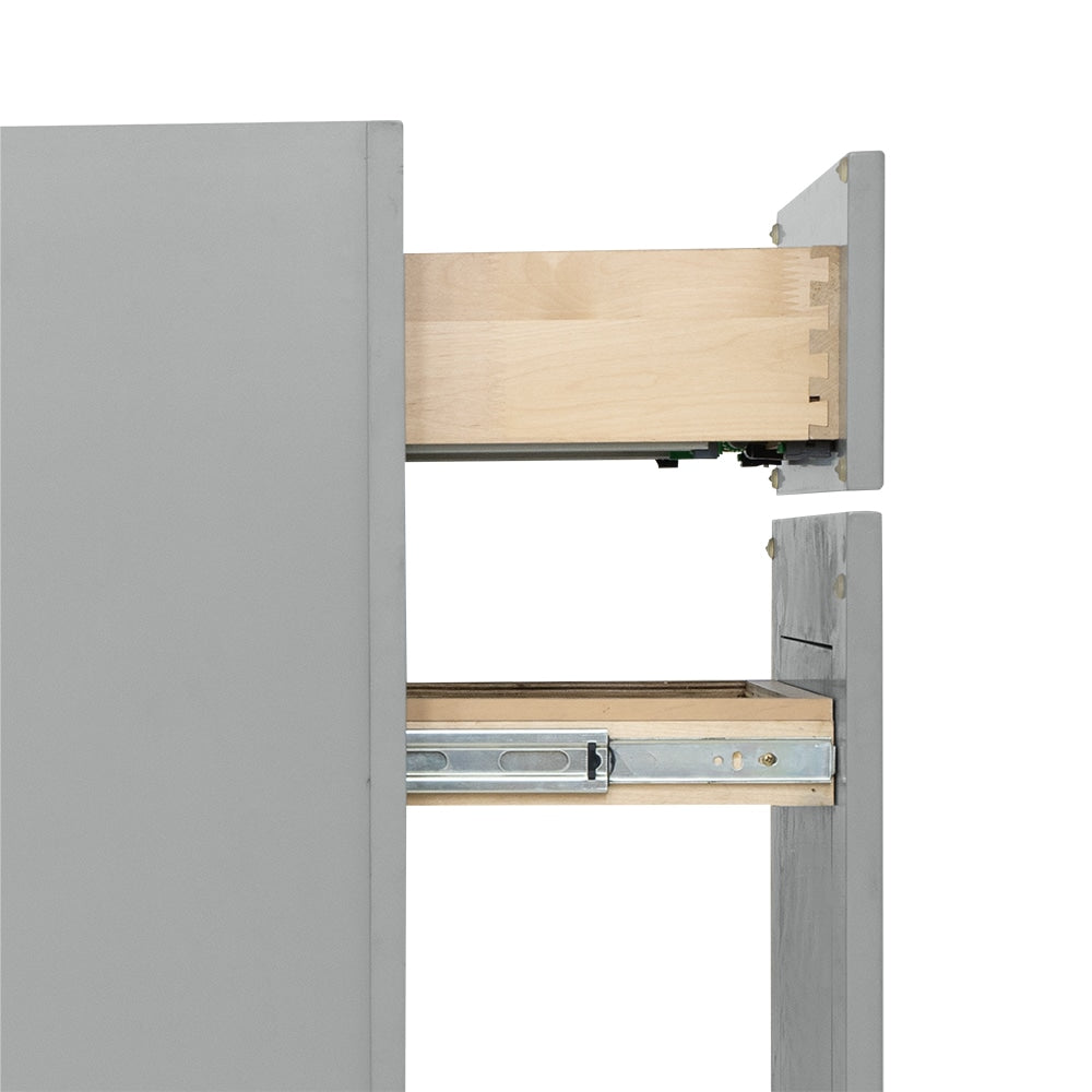 A: While the cabinet features a stylish matte gray painted finish, it is also stainable and paintable, allowing for customization.
