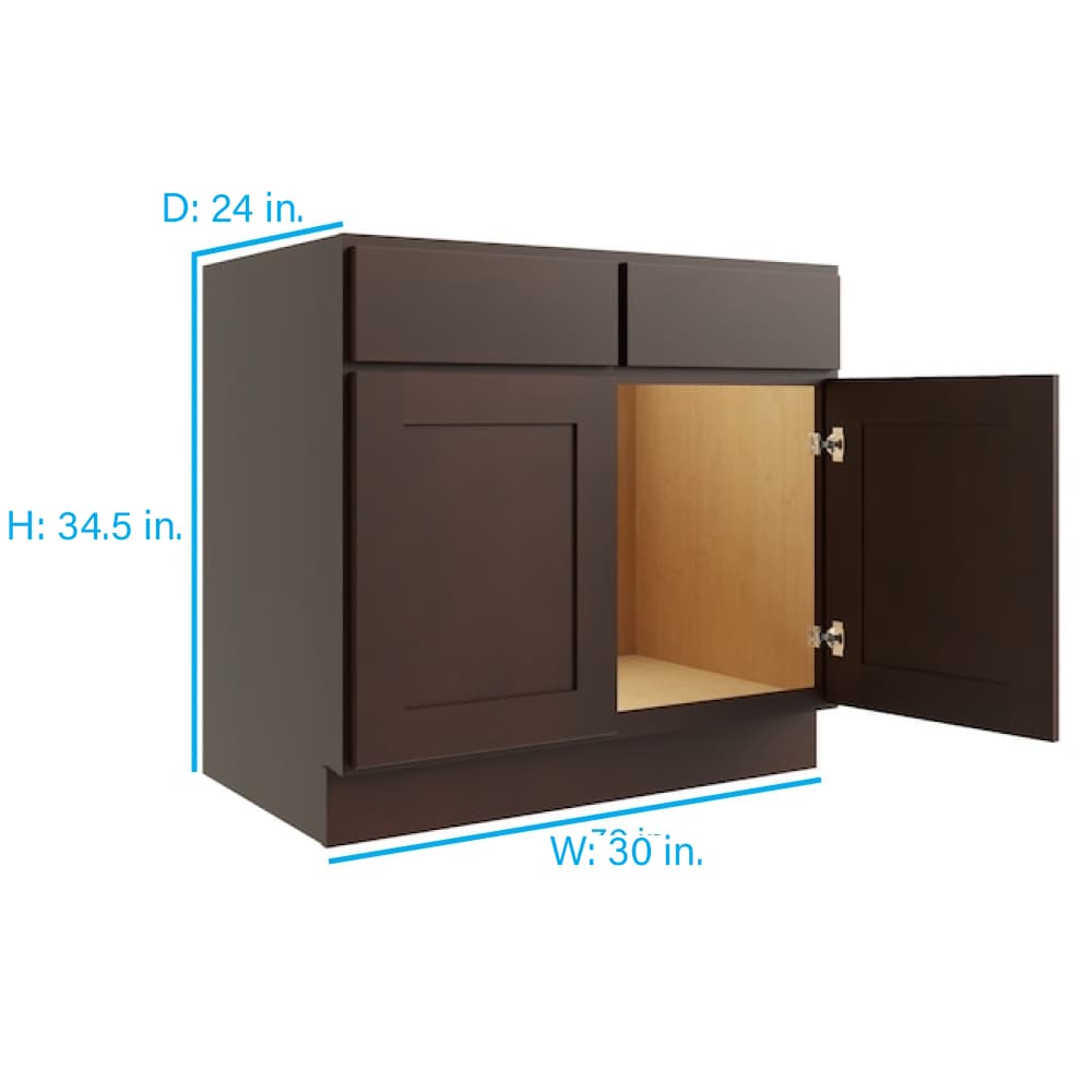 The RELIABILT Parkstone 30-in Sink Base Cabinet in Espresso offers sleek, shaker style elegance to kitchens, bathrooms, or utility rooms. Constructed from durable plywood, it features a smooth, stained exterior and soft-close hinges for quiet operation. Arriving fully assembled, this cabinet simplifies installation and enhances your space effortlessly.