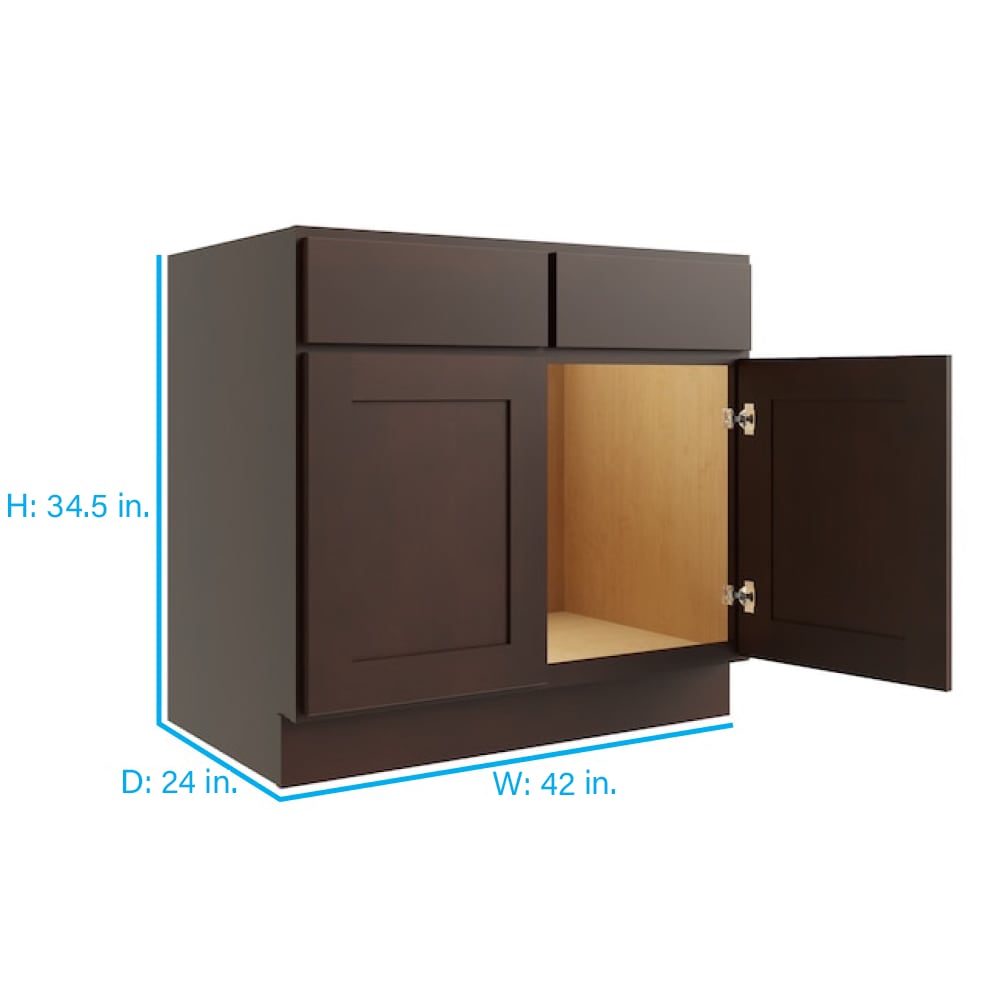 The RELIABILT Espresso Sink Base Cabinet offers a sleek Shaker design for any kitchen or utility room. This 42-inch wide cabinet arrives fully assembled, featuring a durable all-plywood construction with elegant stained espresso finish for both style and longevity. Designed with soft-close hinges and a sink cut-out, it seamlessly integrates functionality with contemporary aesthetic.