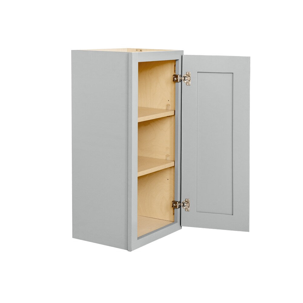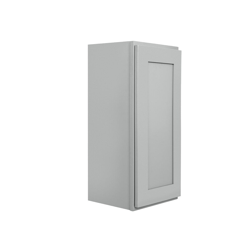 The RELIABILT Overlake 12"x36" Gray Wall Cabinet is a ready-to-assemble solution with a sophisticated recessed panel Shaker door style. Made from durable plywood with a smooth matte gray finish, it combines style and functionality, perfect for kitchen or utility room upgrades. Featuring adjustable shelves and soft-close hinges, it ensures convenient storage and long-lasting use.