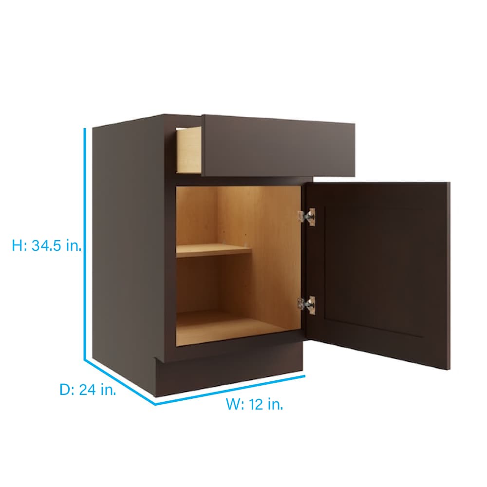 Enhance your kitchen or utility room with the RELIABILT Parkstone 12-inch Base Cabinet. Fully assembled and crafted from durable plywood, it features an elegant espresso stain with a flat panel shaker style that blends simplicity with sophistication. Ideal for pros and DIY enthusiasts seeking quality and style in home renovations.