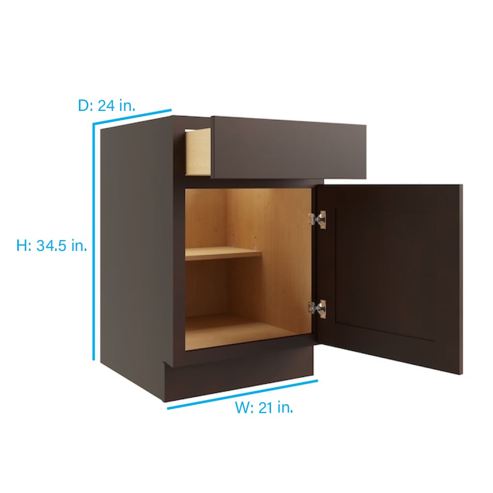 The RELIABILT Parkstone Espresso 1-Drawer Base Cabinet combines timeless Shaker style with durability, featuring an all-plywood construction. Fully assembled and equipped with soft-close hinges, this 21-inch wide cabinet offers elegance and functionality for any kitchen, bathroom, or utility room.