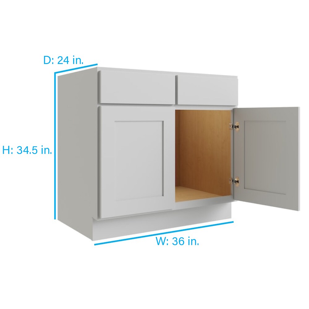 The RELIABILT Parkstone 36-inch base cabinet offers a blend of practicality and elegance with its grey, flat panel shaker door style. Crafted from solid plywood, this fully assembled cabinet ensures durability and a sophisticated touch to any kitchen or workspace. Its style and build quality make it ideal for professional contractors and discerning DIYers seeking a reliable storage solution.
