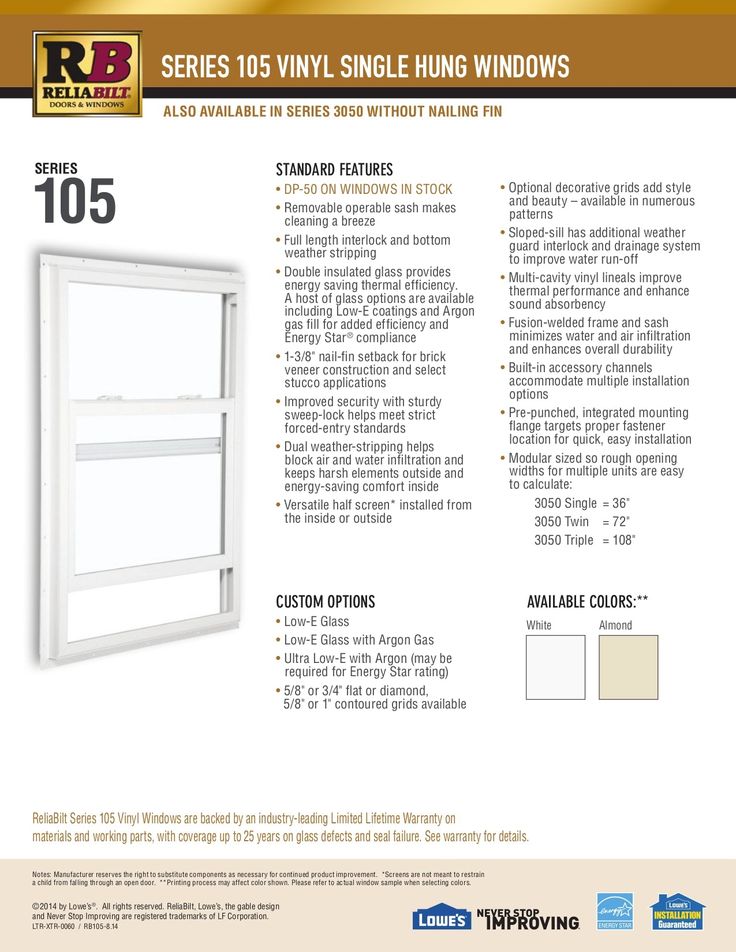 The RELIABILT 105 Series single hung window is the ideal choice for those seeking high performance on a tight budget. Its bottom sash is conveniently side-loaded for easy removal and is operated by dual lift rails. This window is perfect for both new construction and remodeling projects, with its pre-punched, integrated nail fin and built-in accessory channels that offer multiple installation options (nailing fin not available in Series 3050). It boasts a DP-50 rating (Design Pressure rating) for windows up to 36 inches in width and 74 inches in height. The modular sizing makes calculating rough opening widths for multiple units a breeze. Additionally, this window features Low-E glass to reflect solar energy and is insulated with Argon gas for enhanced thermal efficiency (Note: ENERGY STAR qualifications may vary by region; please refer to the U-Value and SHGC value for specific specifications).