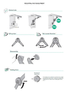 A horizontal opening system for lift-up cabinet doors that offers hold-open or soft-close functionality. Simple to adjust with a 75°–110° opening range, ideal for wood doors and aluminum frame doors.