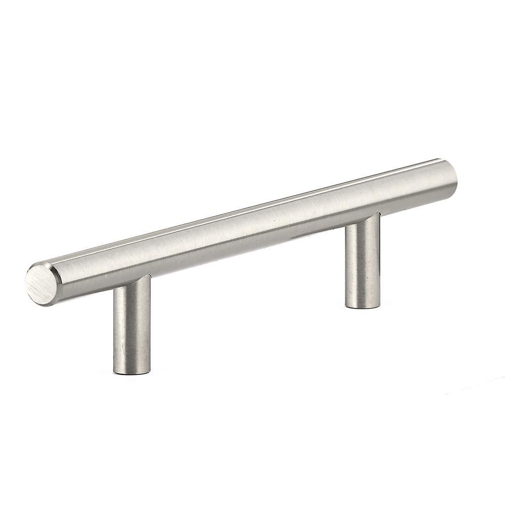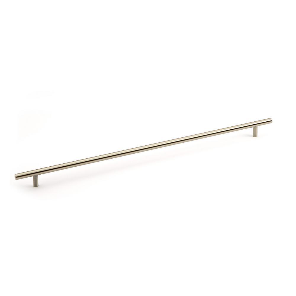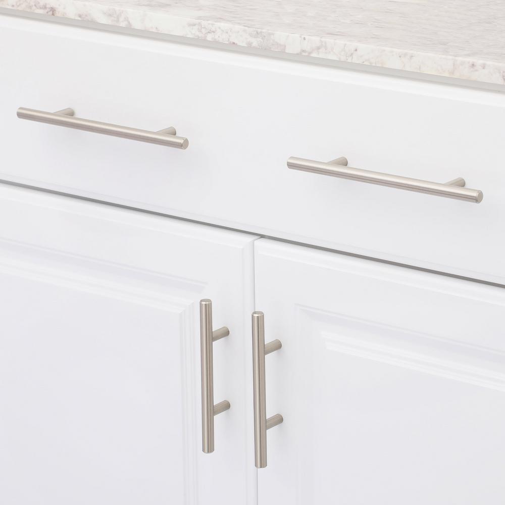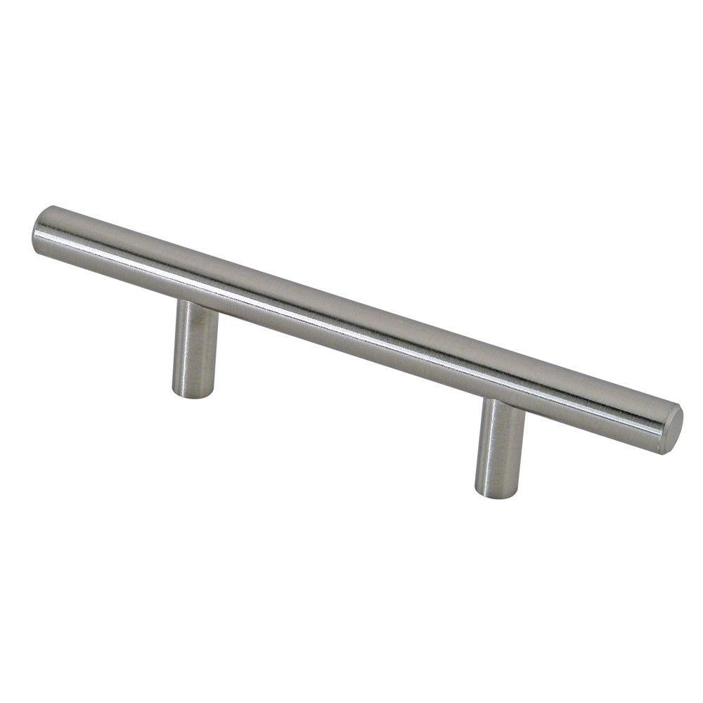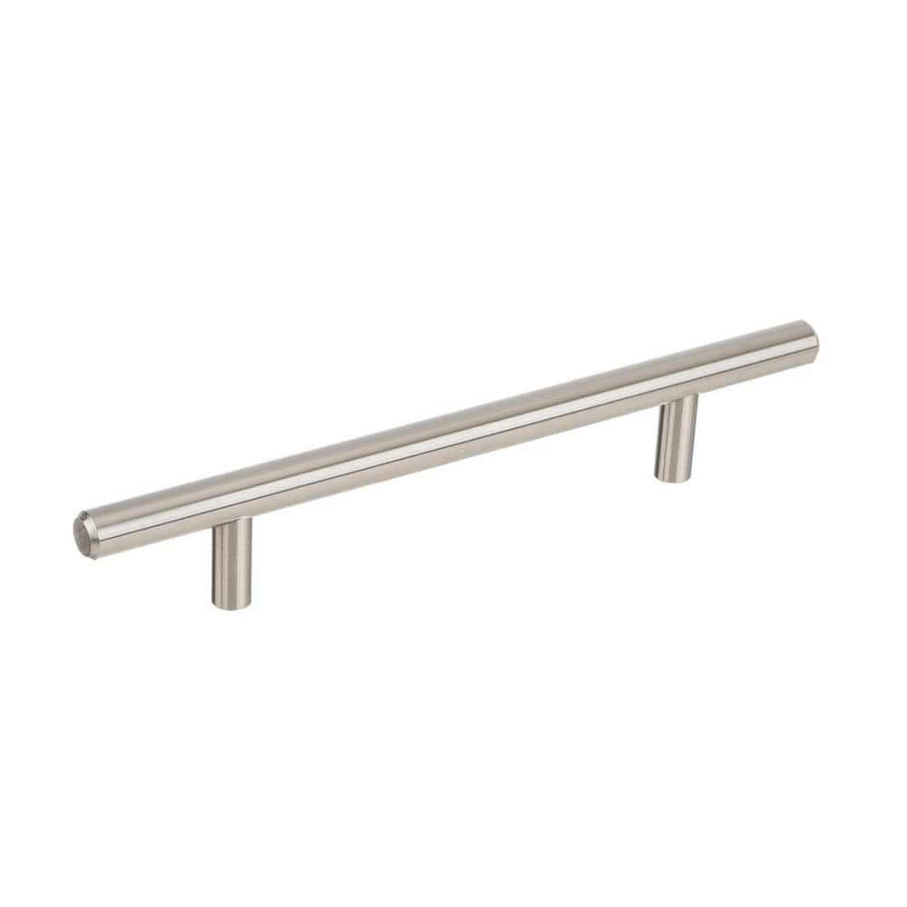 Solid steel bar pull in a modern brushed nickel finish for cabinets and drawers. 5-1/16 in. (128 mm) center-to-center spacing with rounded corners for comfortable grip. Mounting screws included for easy installation.