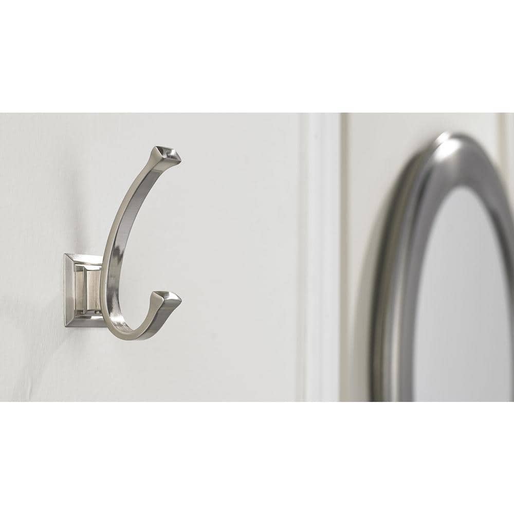 Transitional metal wall hook by Richelieu in a durable brushed nickel finish. Dual-arm design offers reliable storage for coats, towels, or bags with a 22 lb. capacity when mounted to studs. Mounting hardware included for quick installation.