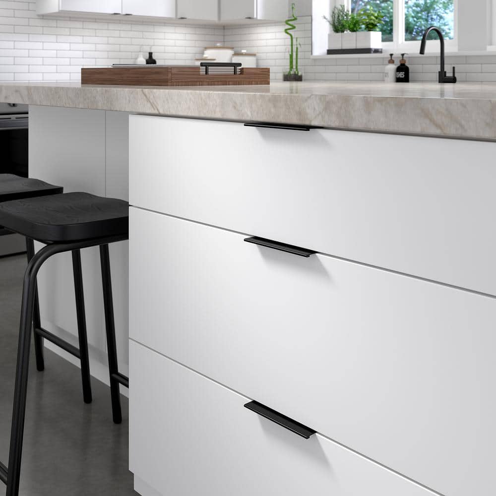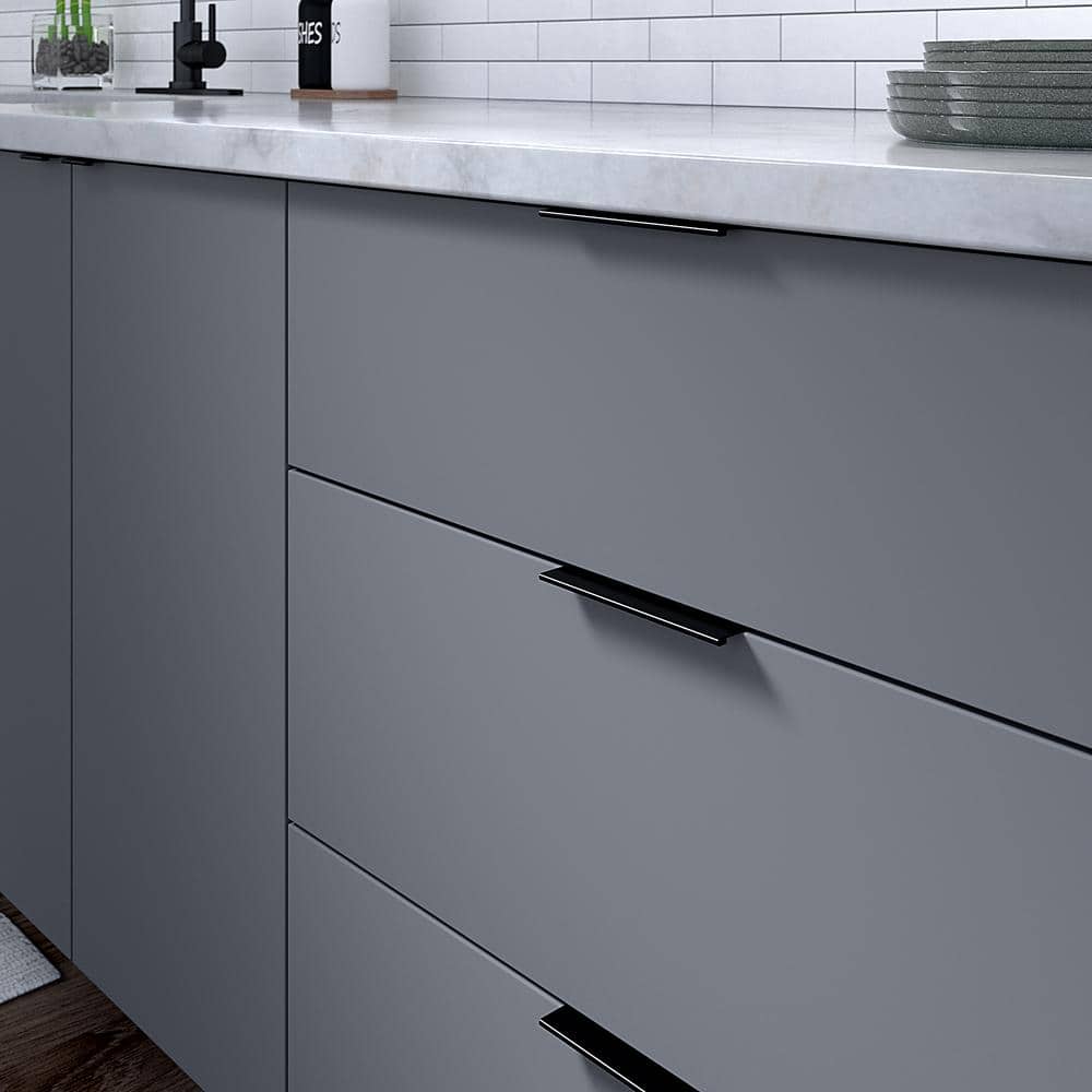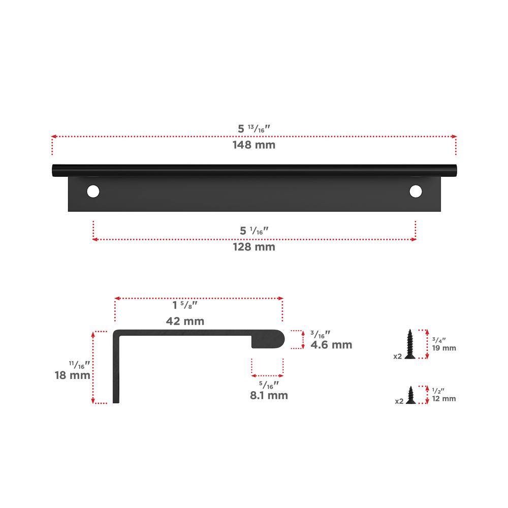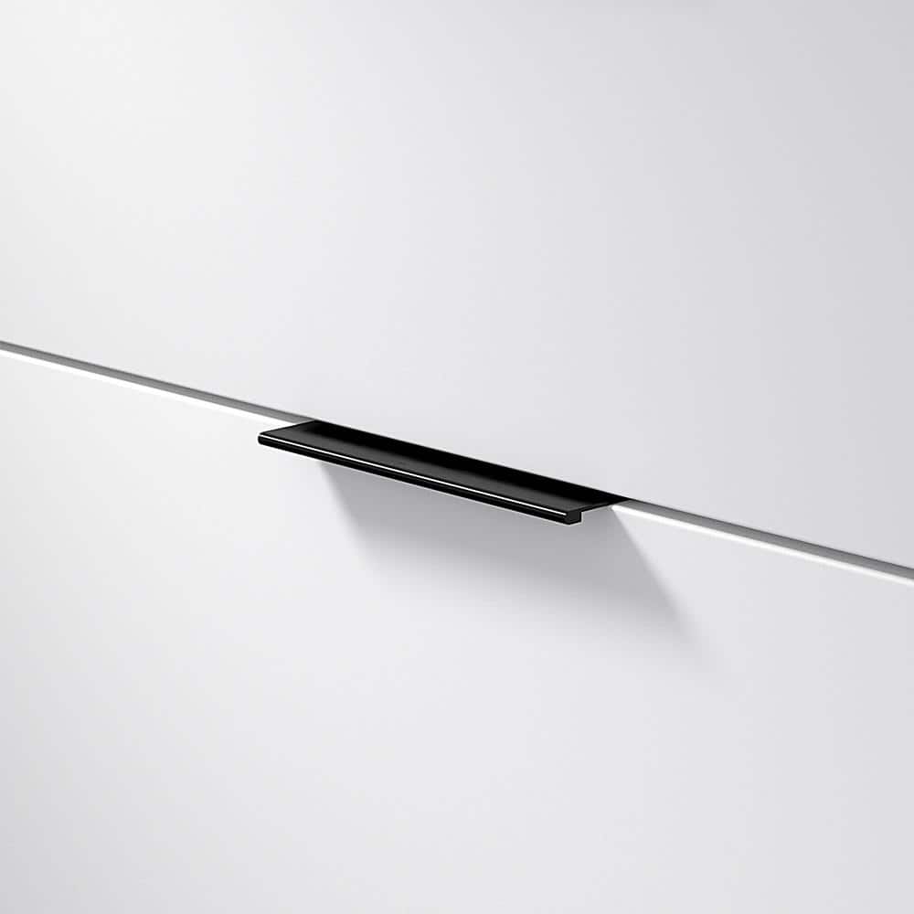 Sleek aluminum finger pull in a brushed black finish for modern kitchens and baths. Designed for 5-1/16 in. (128 mm) center-to-center mounting, it offers a low-profile grip that’s durable, rustproof, and easy to install.