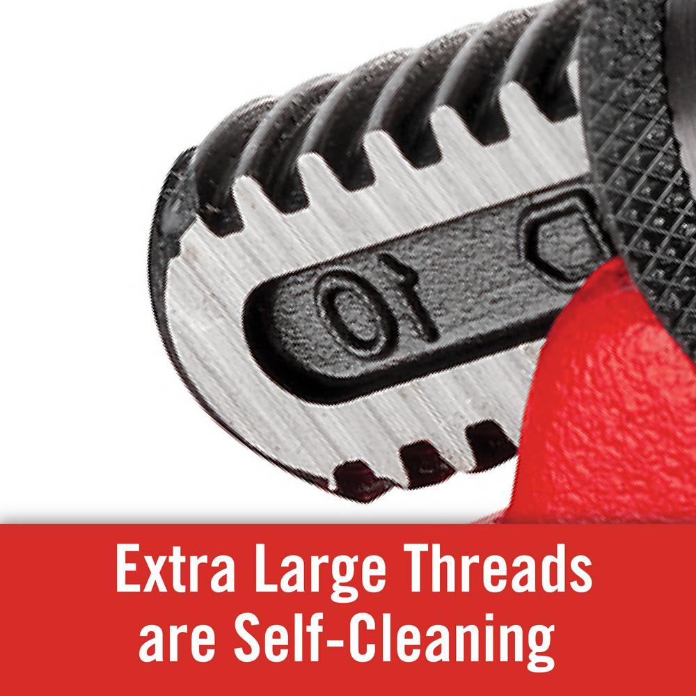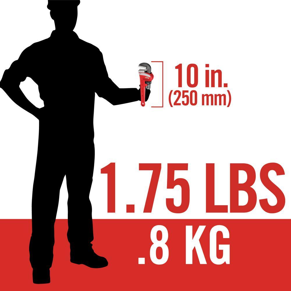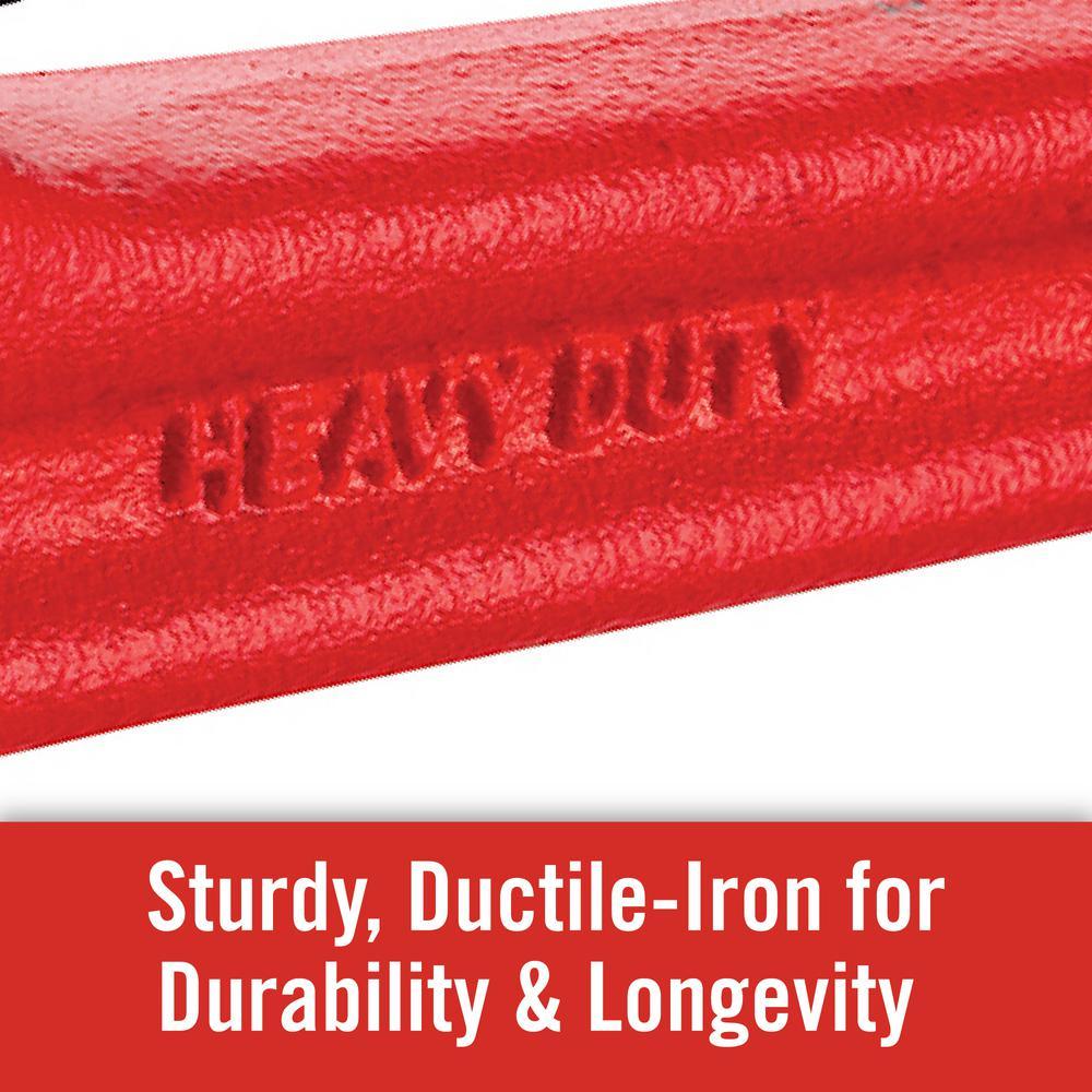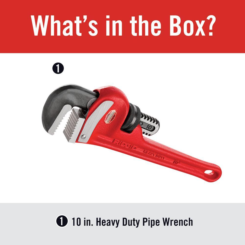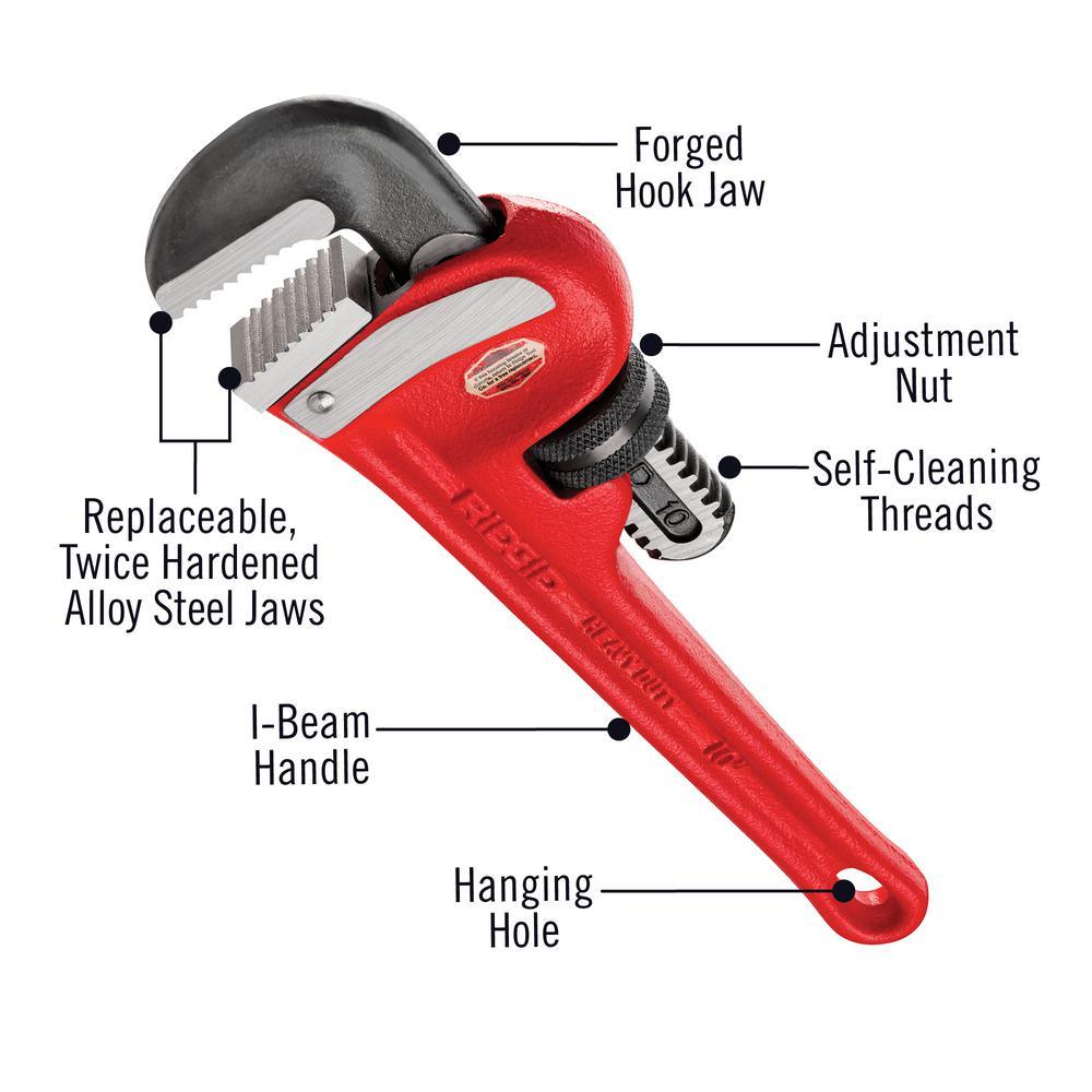 A useful addition to any plumber's toolbox, the RIDGID 10 in. Heavy-Duty Straight Pipe Wrench is a plumbing wrench that features sturdy ductile-iron housing and an I-beam handle for exceptional durability and leverage. It has a quickly adjustable full-floating forged hook jaw featuring self-cleaning threads and easily replaceable spring assembly, hook jaw and heel jaw. A versatile plumbing tool, this straight pipe wrench is suited to all types of pipe work and comes in a convenient red color that is always easy to find. This 10 in. plumbing wrench is ideal for pipe diameters of 1/4 in. to 1 in. with a capacity of up to 1-1/2 in.