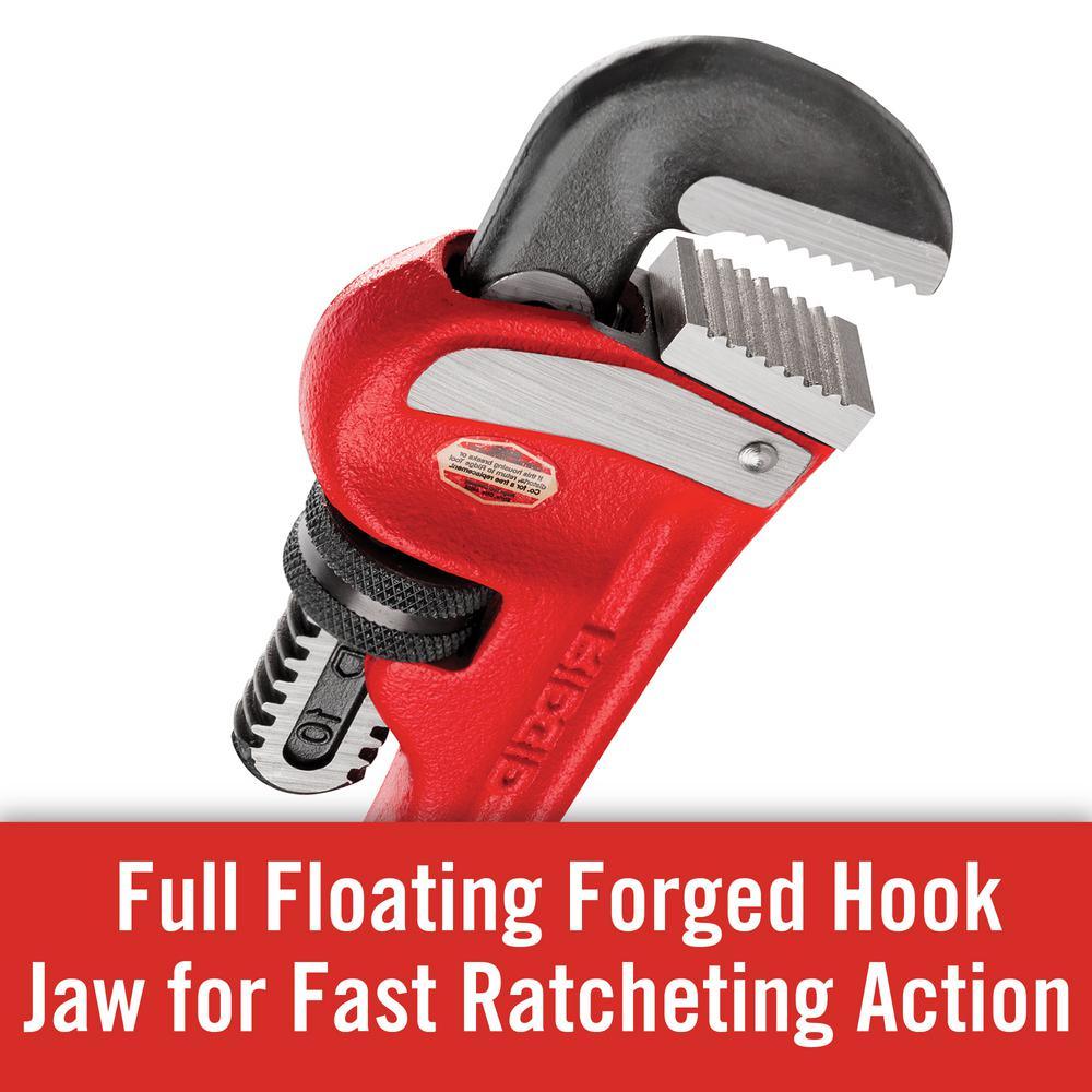 • Heavy-duty pipe wrench features a full floating forged hook jaw for superior gripping and quick adjustments