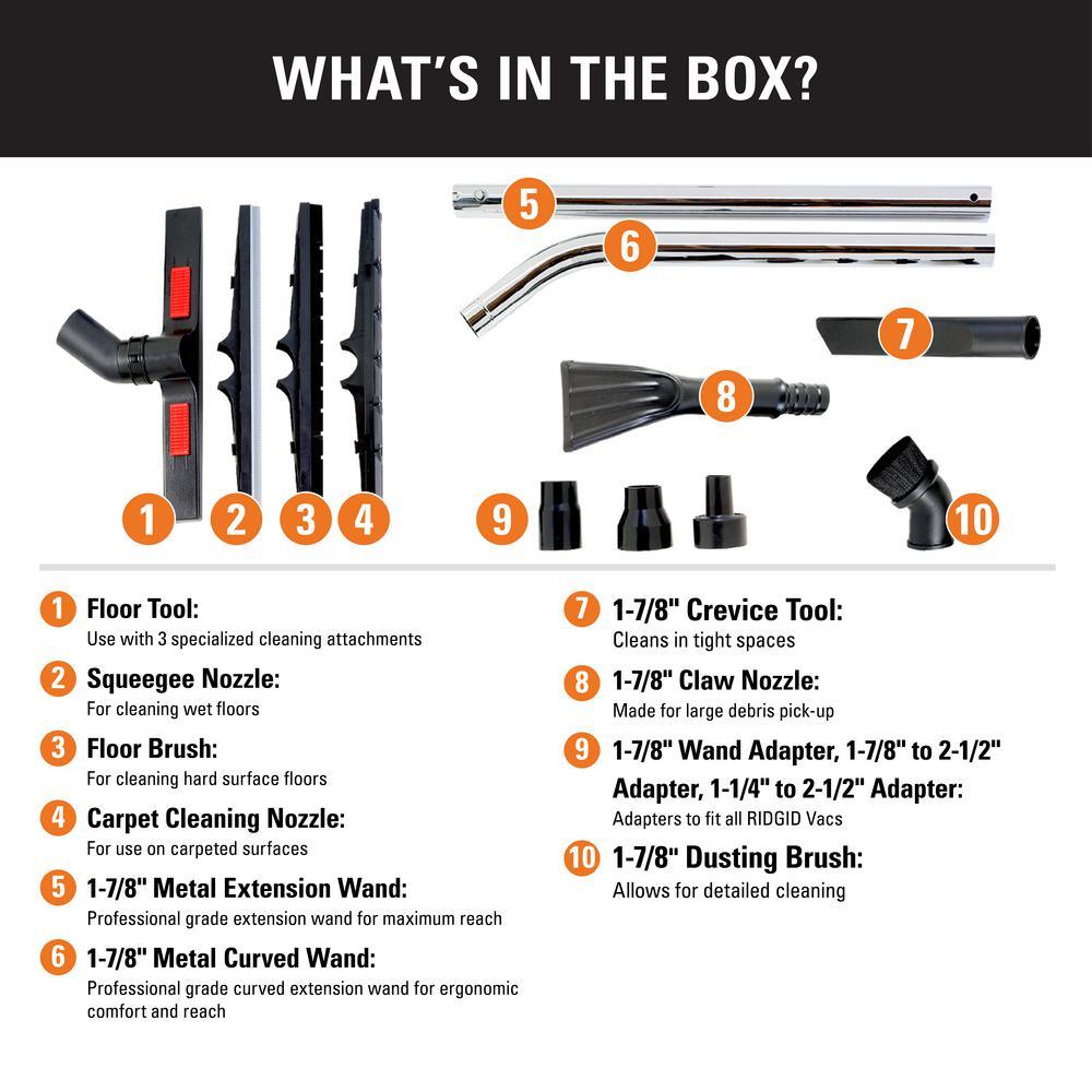 The RIDGID Wet/Dry Vac Heavy-Duty Cleaning Kit is an ideal collection of accessories for tough clean-up jobs. This kit includes an adapter to fit wands and tools 1-7/8 in. and 2-1/2 in. hose and 3-specialized cleaning attachments including a squeegee for cleaning wet floors, a carpet cleaning nozzle and a floor brush for hard surfaces. This kit also features a professional metal wand and bent wand for ergonomic comfort and lasting durability.