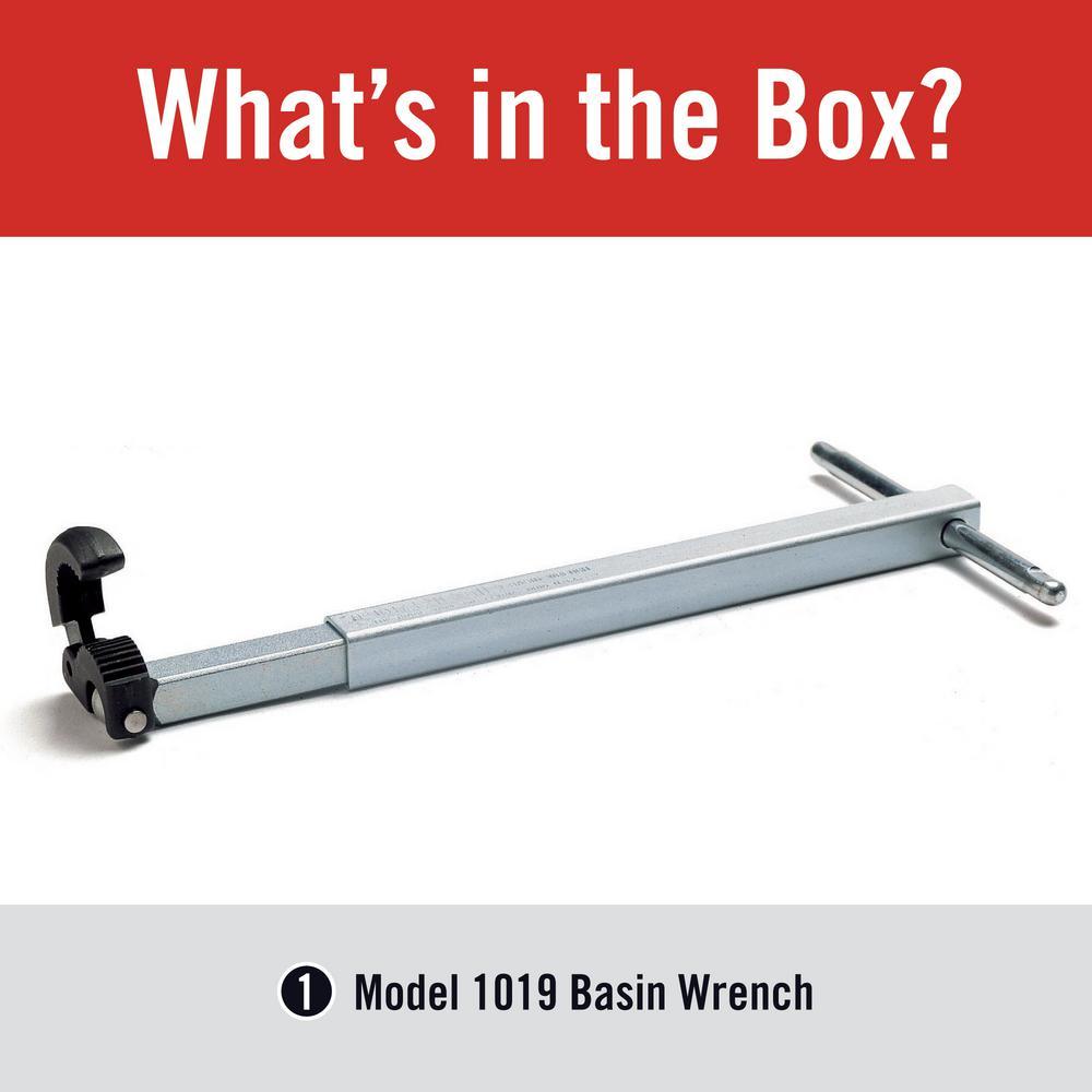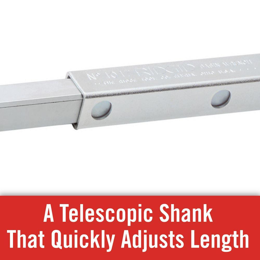 A practical addition to any plumber's toolbox, the RIDGID 1019 Telescoping Basin Wrench allows you to easily access tight spaces. An excellent tool for under-sink applications, it has a telescopic shank that quickly adjusts from 10 in. to 17 in. so you can easily select the right length for the job. Featuring spring-loaded jaws made of strong forged alloy steel, the adjustable basin wrench delivers fast, one-hand ratcheting. A tension plug holds the head in any position at up to a 90. This telescoping basin wrench has a 1-1/4 in. to 2-1/2 in. pipe capacity.