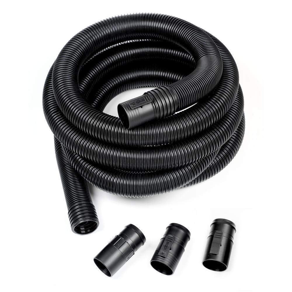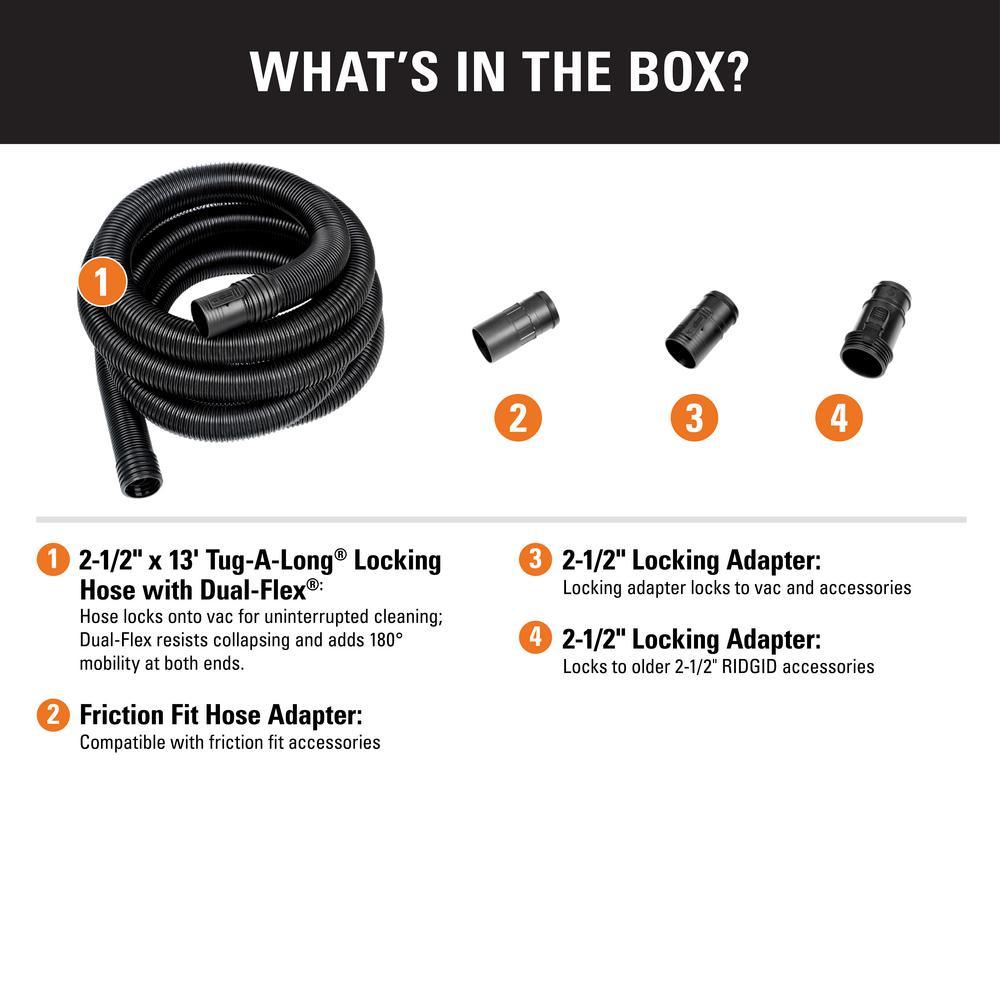 RIDGID's 2-1/2 in. Dual-Flex Tug-A-Long locking hose extends up to 13 ft. for more reach and flexibility than a standard wet/dry vac hose. With the new locking design, your hose locks onto both your vac and your wand or accessory, so nothing falls during use. It fits all RIDGID 2-1/2 in. inlet configurations and includes 3 adapters for compatibility. The hose's Dual-Flex feature adds 180° mobility at each end and its flexible design resists clogging. Easily detach by releasing the locking tab or twisting off. The 2-1/2 in. opening is the optimal size for tackling large messes with a RIDGID wet dry vac. Maximum your vac and get the most out of your cleaning tools with RIDGID's 2-1/2 in. locking accessories.