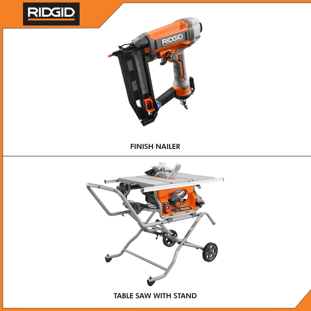 RIDGID introduces the 10 in. Pro Jobsite Table Saw with Stand and 16-Gauge 2-1/2 in. Straight Finish Nailer. This heavy duty saw is equipped with a 5000 RPM motor. It features an updated portable folding stand that provides a single-point release for simple 1-step setup and great jobsite portability. Users can easily complete jobs wit this saw's easy-to-use onboard storage for the miter gauge, extra blades, rip fence, and other accessories. The Straight Finish Nailer delivers consistent professional results with every trigger-pull. Packed with CLEAN DRIVE Technology, this nailer delivers over 17X more consecutive perfect drives versus the competition. This results in less time fixing and more time working. As part of the new lineup of RIDGID Pneumatic Tools, this is sure to be a staple in contractor's toolboxes. Backed by the Industry's Only Lifetime Service Agreement, this saw includes a 10 in. blade, a blade guard assembly, a portable folding stand, the 16-Gauge 2-1/2 in. Straight Finish Nailer with sample nails, a bag, and an operator's manual.