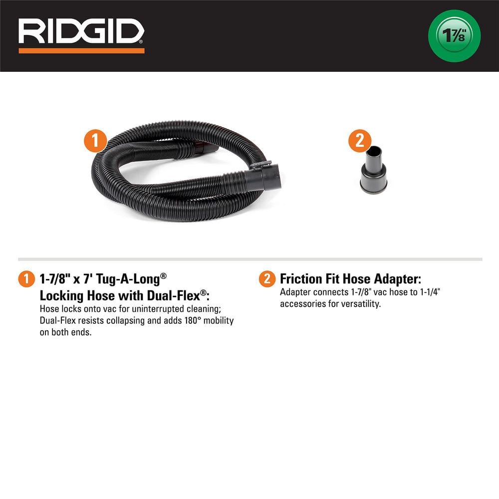 A durable Tug-A-Long Dual-Flex locking hose designed for RIDGID wet/dry vacuums, providing a secure connection and 7 feet of reach. Includes an adapter to connect 1-7/8 in. hoses to 1-1/4 in. accessories for versatile cleanup of dust, debris, and wet messes.