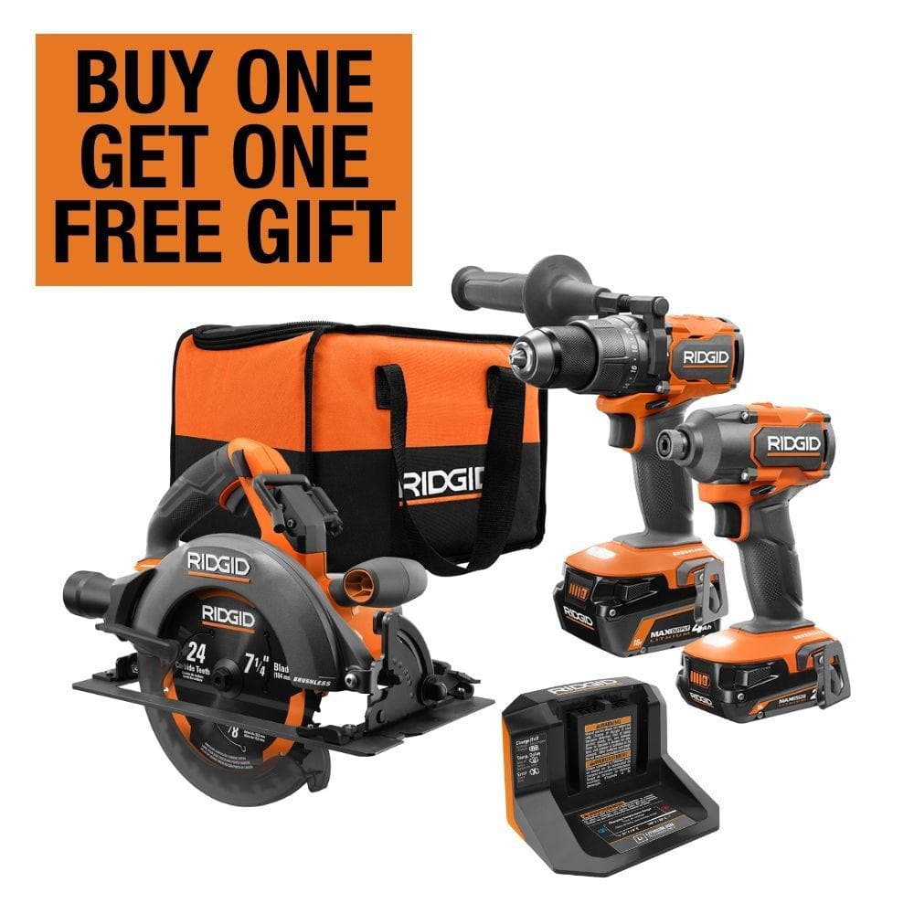 Take on challenging projects with confidence using the RIDGID 18V Brushless Cordless 2-Tool Combo Kit. This robust set includes a powerful hammer drill and a three-speed impact driver with brushless motors, providing enhanced torque and life. Accompanied by two MAX output batteries, a circular saw, and a lifetime service agreement, this kit ensures superior performance and peace of mind.