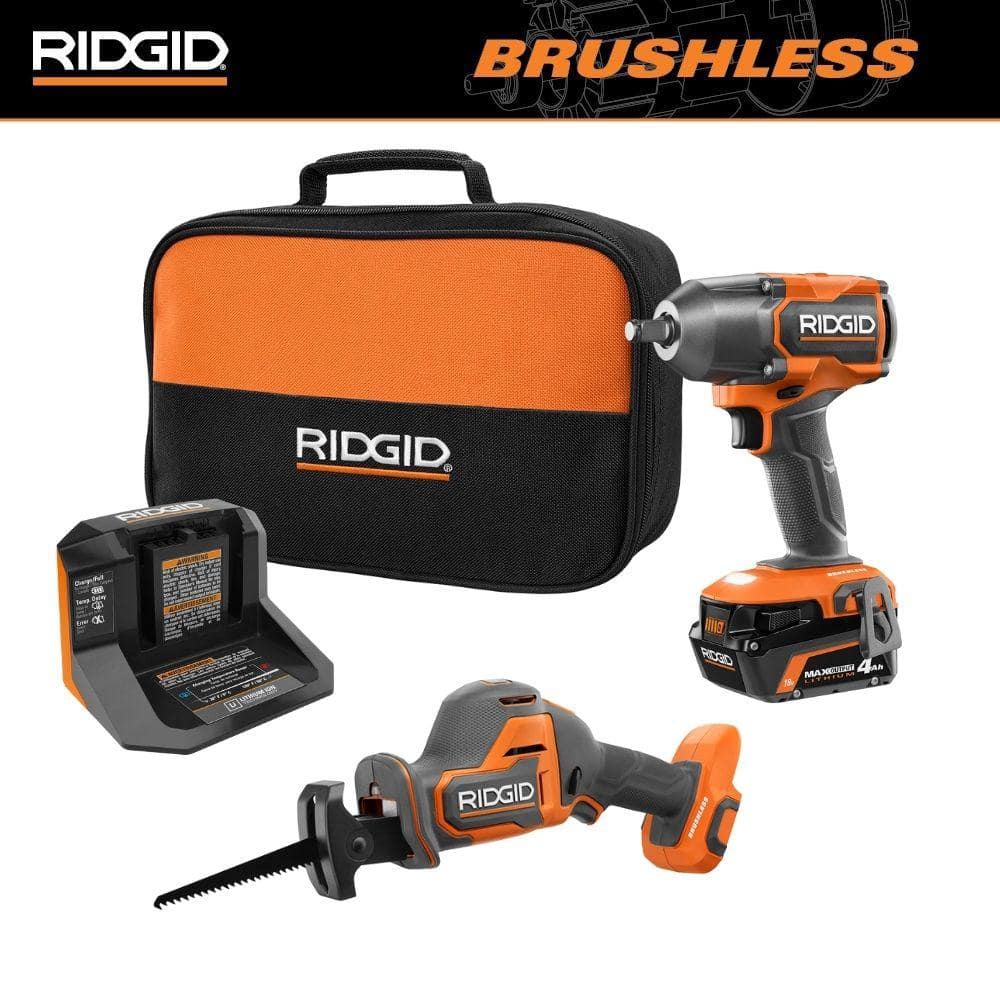 RIDGID 18V Brushless Cordless 2-Tool Combo Kit w/ Impact Wrench, SubC One Handed Recip Saw, 4.0 Ah MAX Output Battery & Charger