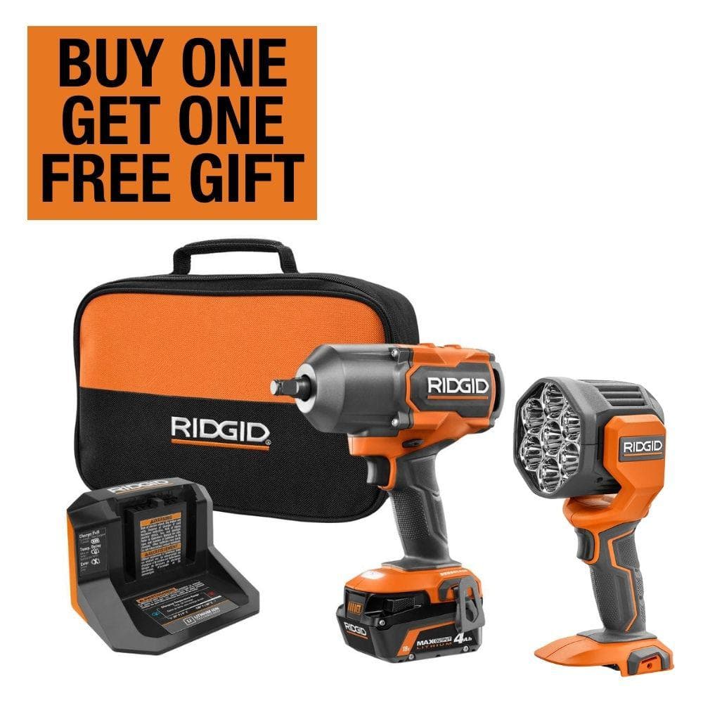 RIDGID 18V Brushless Cordless 2-Tool Combo Kit with High-Torque Impact Wrench, LED Spotlight, 4.0 Ah Battery, and Charger