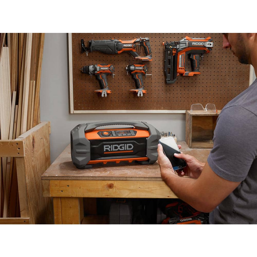 • Bluetooth + App Control: Stream music and adjust presets, EQ, and battery status via RIDGID Radio App