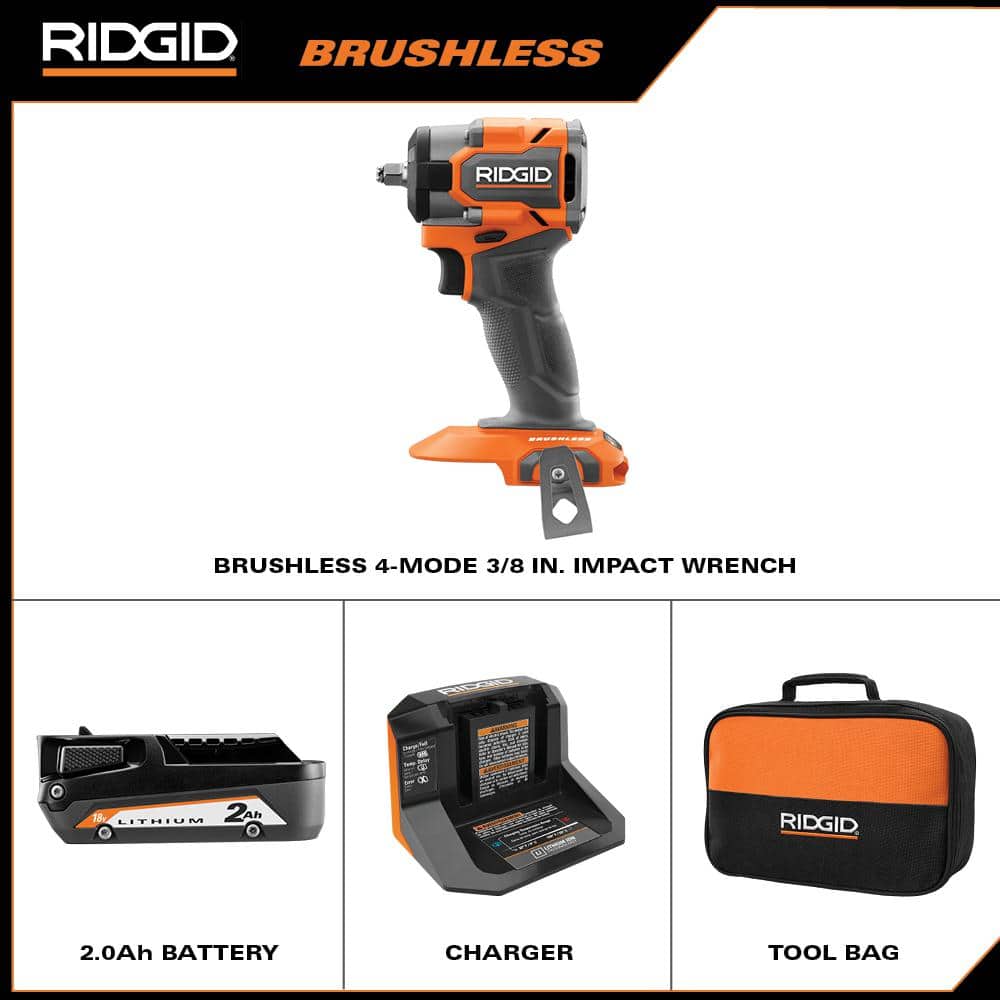 RIDGID 18V SubCompact Brushless Cordless 3/8 in. Impact Wrench Kit with 2.0 Ah Battery, Charger, and Bag