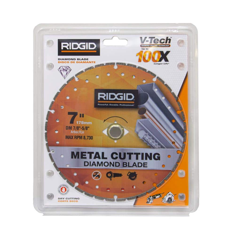 Engineered for fast, precise cuts in metal, this RIDGID 7 in. diamond blade uses V-TECH vacuum-brazed technology for durability and speed. Ideal for studs, pipe, and angle steel, it fits most 7 in. grinders and circular saws with 7/8 in.–5/8 in. arbor.