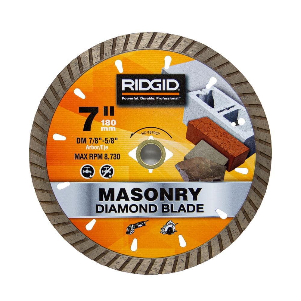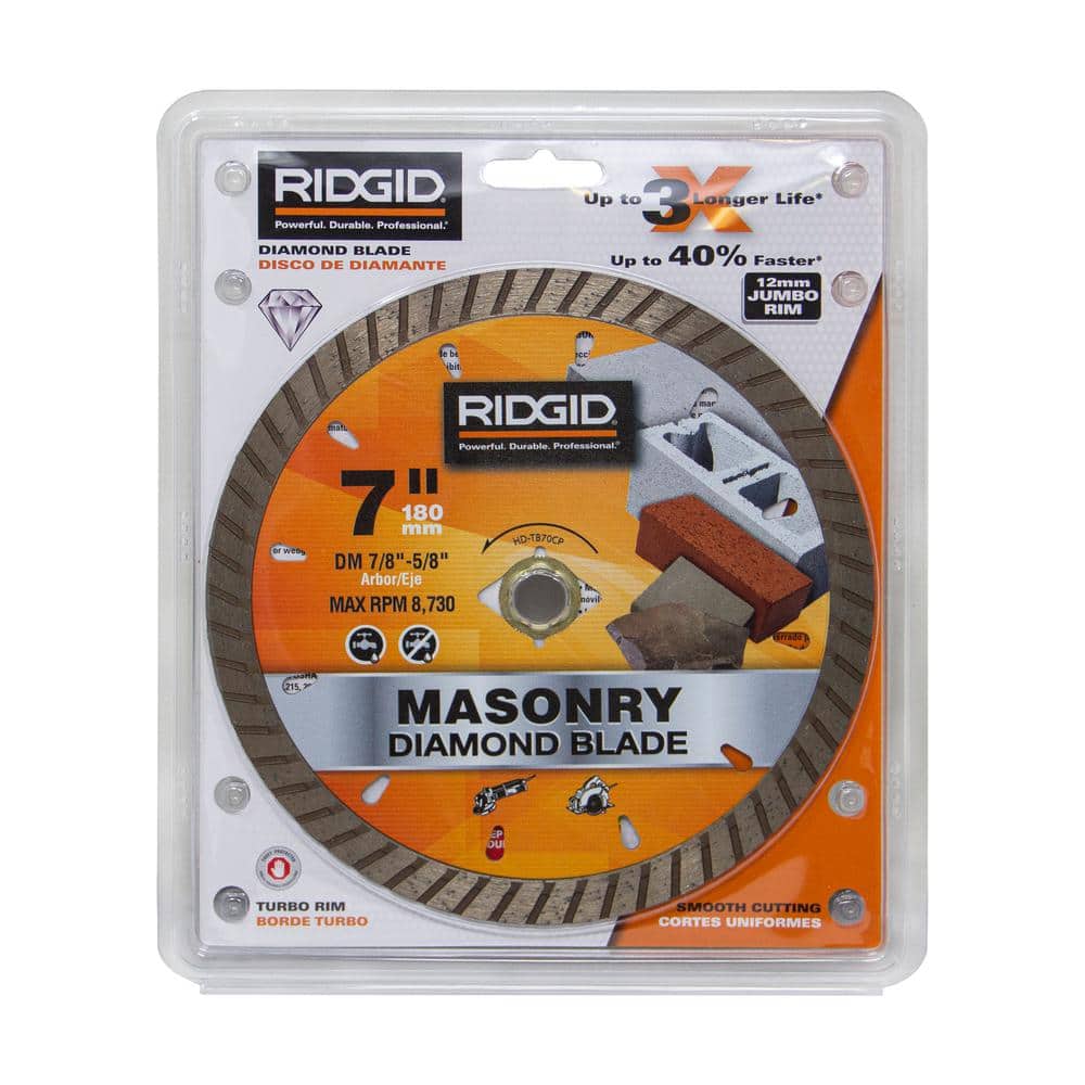 Professional-grade RIDGID turbo diamond blade engineered for fast, clean cuts in masonry materials. Designed for use on 7 in. angle grinders and circular saws, it features a turbo rim with high-grade diamonds for speed and longevity.