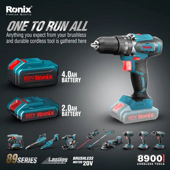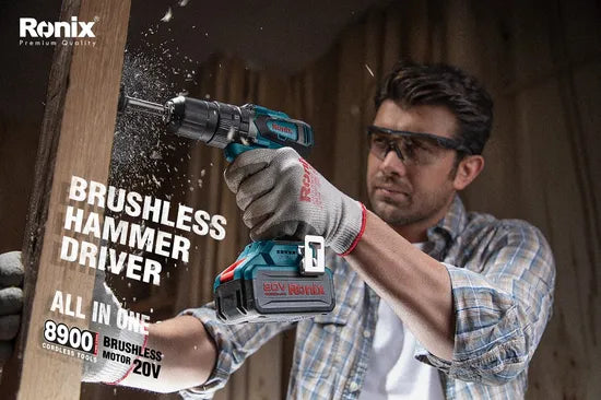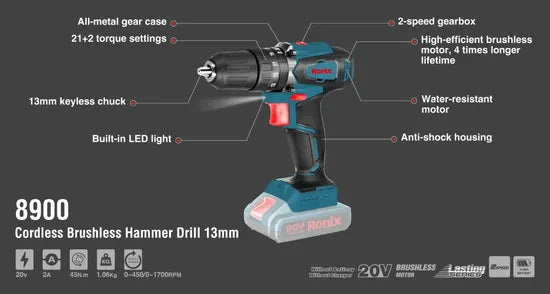 Ronix 8900K 20V Power Hammer Drills DC Durable High-Powered 13mm Cordless Impact Drill