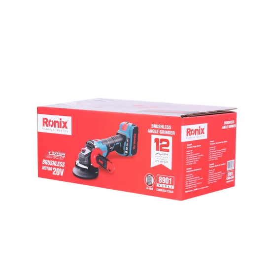The Ronix 8901 Cordless Mini Angle Grinder is a high-performance tool designed for professionals and DIY enthusiasts alike. Its brushless motor delivers powerful, efficient grinding with a no-load speed of up to 8500 RPM, all powered by a robust 20V lithium-ion battery. Lightweight and ergonomic, it's the perfect choice for precision tasks in the workshop or at home.