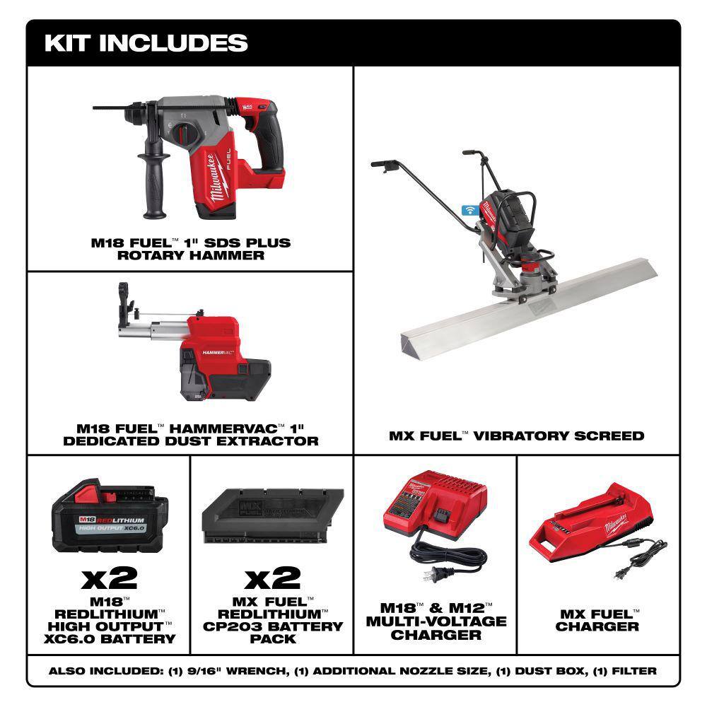 Milwaukee MX FUEL Cordless Vibratory Screed Kit with M18 FUEL 1 in. SDS‑Plus Rotary Hammer & Dust Extractor (MXF381-2CP/2912-22DE)